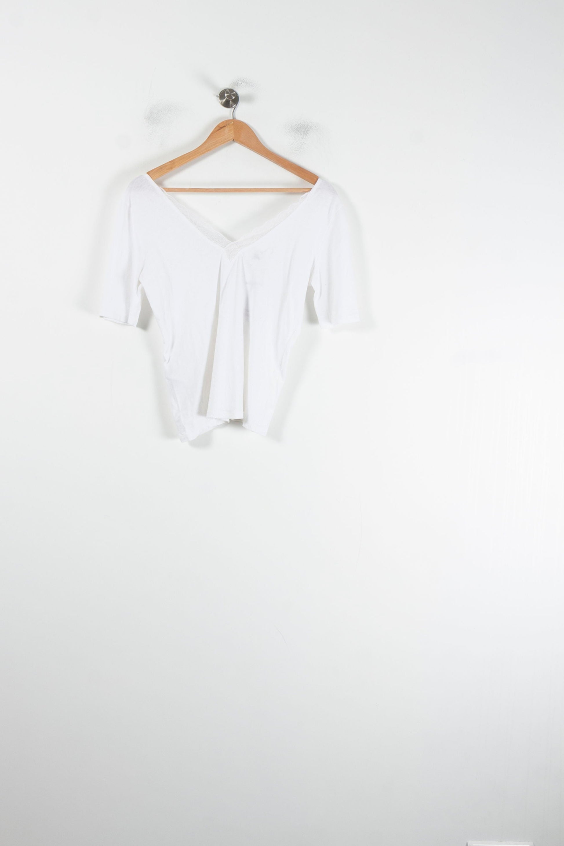 Top blanc à col V Des Petits Hauts, taille XS/34, idéal pour compléter une garde-robe élégante. Confectionné dans un mélange raffiné de coton (70%) et de lin (30%) avec une doublure en polyamide, ce top se distingue par sa délicate encolure en V ornée de dentelle qui apporte une touche subtile de féminité. Parfait pour un déjeuner en terrasse ou une promenade estivale, associé à un pantalon fluide ou une jupe légère.