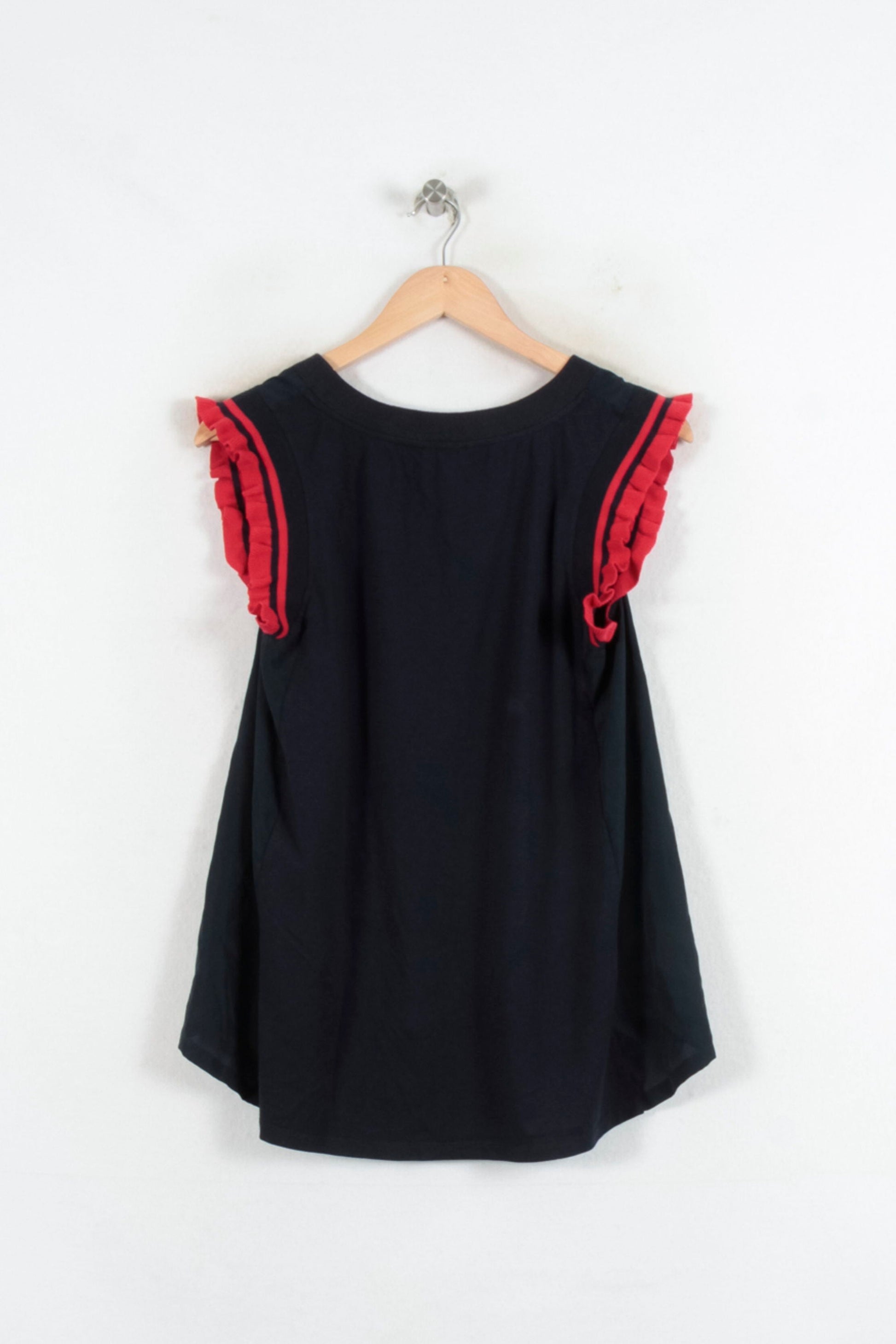 Top bleu Claudie Pierlot taille M/38, sans manches, orné de volants rouges sur les épaules qui apportent une touche d’originalité. La matière semble fluide et légère, soulignée par des détails plissés contrastés au niveau des manches, qui rendent ce haut unique et élégant. Idéal pour un déjeuner en terrasse ou une sortie entre amis, associé à une jupe ou un pantalon ajusté.
