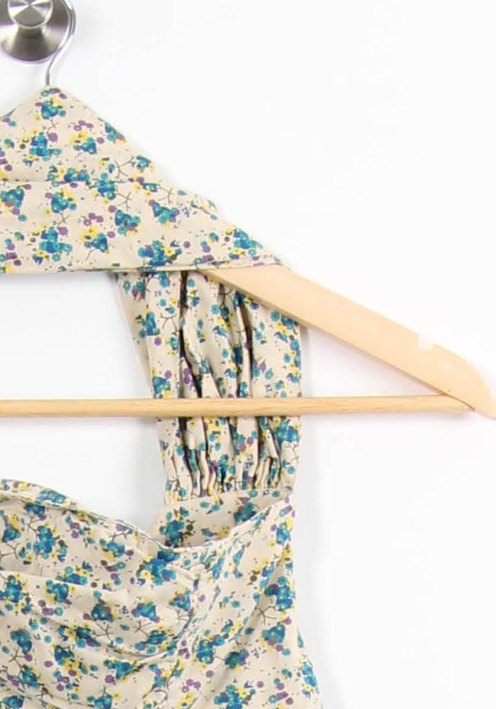 Top dos-nu fleuri beige Zadig&Voltaire, taille XS/34. Ce haut en tissu léger présente un imprimé fleuri bleu et violet sur fond beige, un drapé travaillé sur le buste et un effet plissé à la taille, conférant au modèle une allure délicate et féminine. Idéal pour une balade printanière ou une sortie estivale en journée.