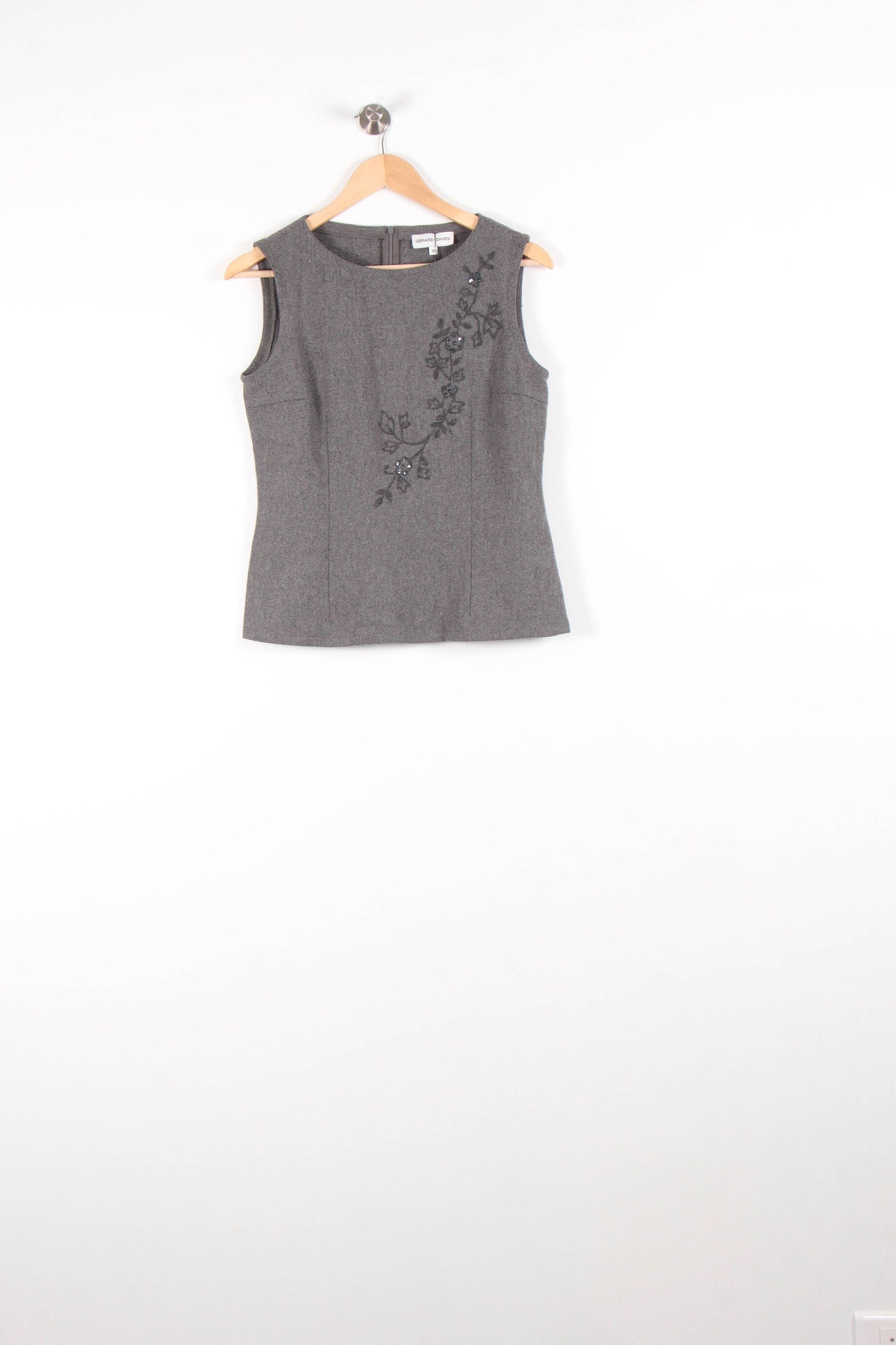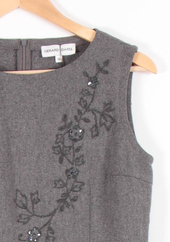 Top gris sans manches en taille M/38, signé Gerard Darel, élégamment orné de broderies florales sur l’avant. Ce modèle structuré présente une matière épaisse au toucher laineux, relevée par de délicates broderies et perles noires qui lui confèrent un raffinement discret et unique. Idéal pour une réunion professionnelle ou un dîner chic, ce top se distingue par son allure sophistiquée.