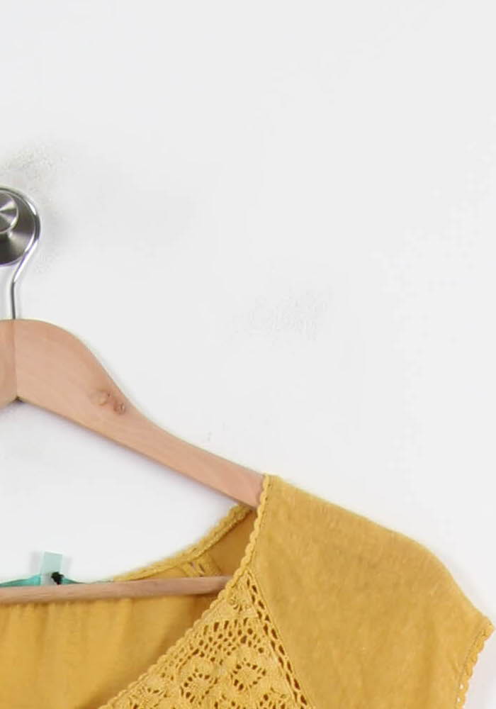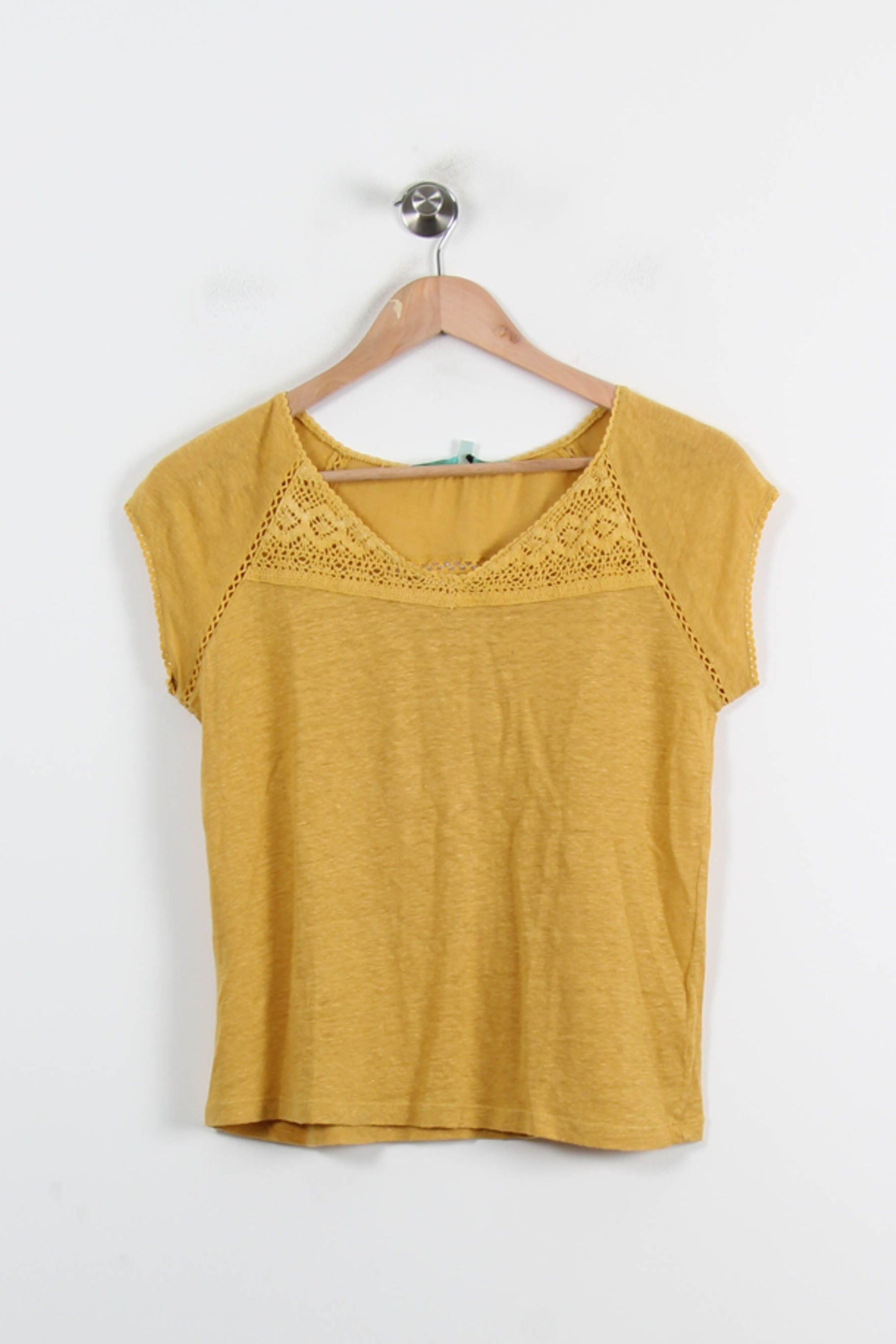 Top jaune La Fée Maraboutée taille S/36, doté d’un col en V et de manches courtes. Sa matière légère est sublimée par des détails ajourés en crochet sur l’encolure et les épaules, offrant un style raffiné et une touche d’originalité à ce basique intemporel. Ce top est idéal pour une journée estivale, associé à un pantalon léger ou une jupe pour une allure chic et décontractée.