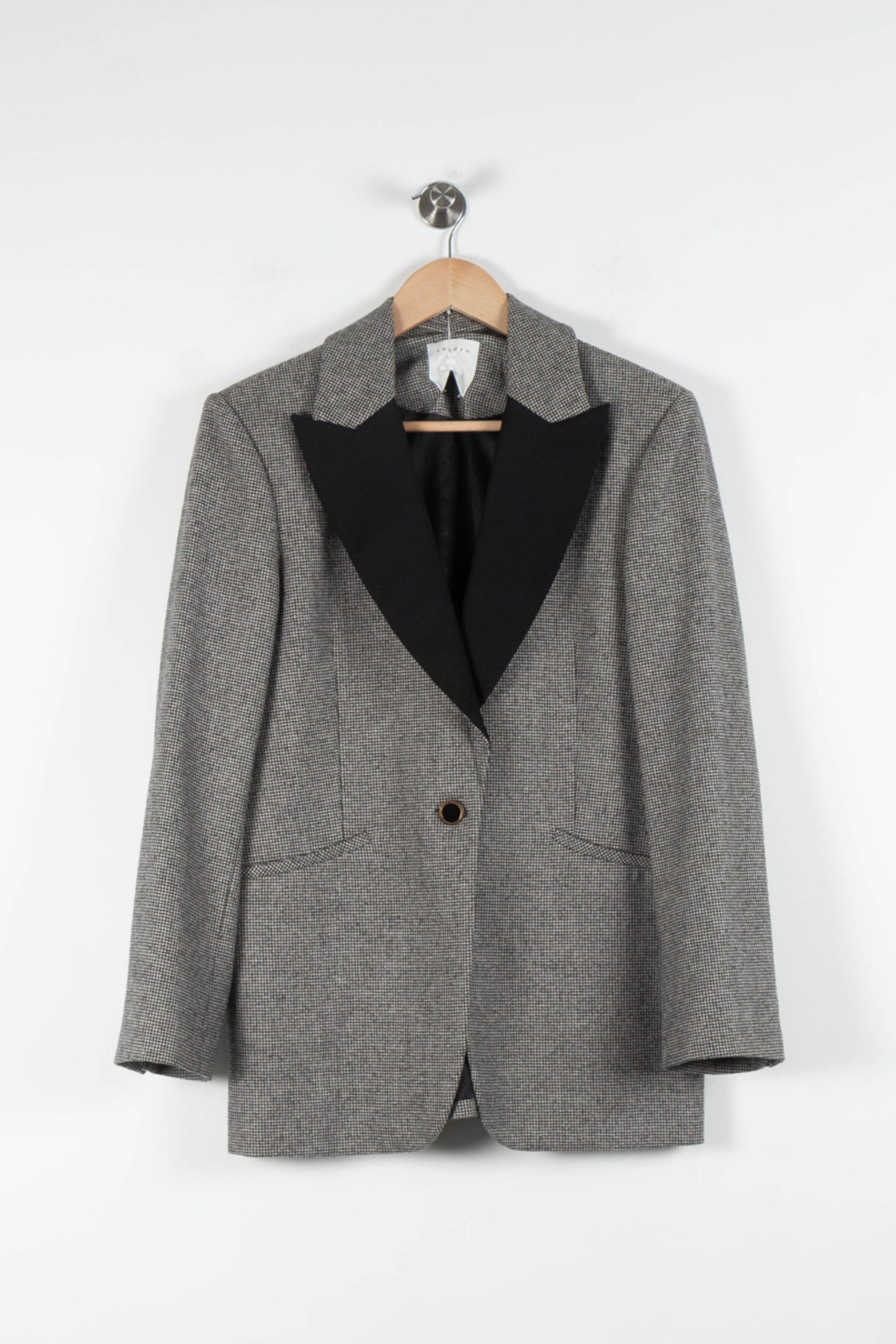 Veste blazer Sandro pour femme, taille M/38, de couleur beige avec un col contrastant noir qui apporte une touche sophistiquée. Confectionnée dans une matière texturée à motif pied-de-poule, cette pièce se distingue par son large col noir, sa fermeture à un bouton et ses finitions impeccables, signatures de la maison Sandro. Parfaite pour une réunion professionnelle ou pour rehausser une tenue de soirée avec une élégance discrète.
