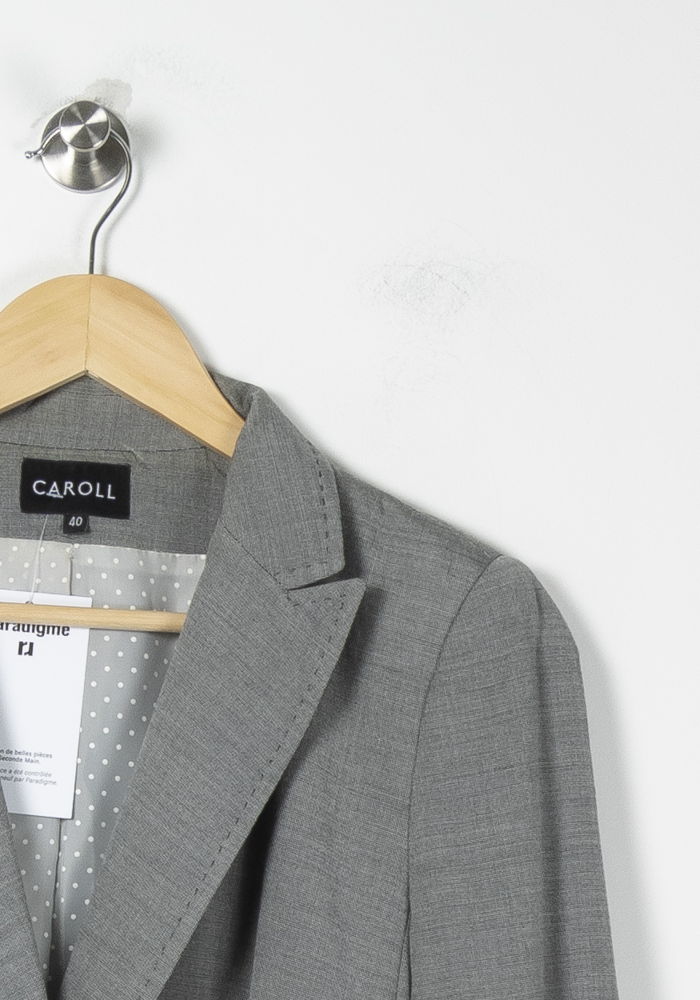 Veste droite grise Caroll, taille L/40, à la coupe élégante et classique, idéale pour un look professionnel ou habillé. Confectionnée en laine majoritaire avec une touche d’élasthanne pour le confort, elle présente une doublure raffinée à motif pois et une finition soignée à un bouton, soulignant son style intemporel et sophistiqué. Parfaite pour une journée au bureau ou un rendez-vous formel.