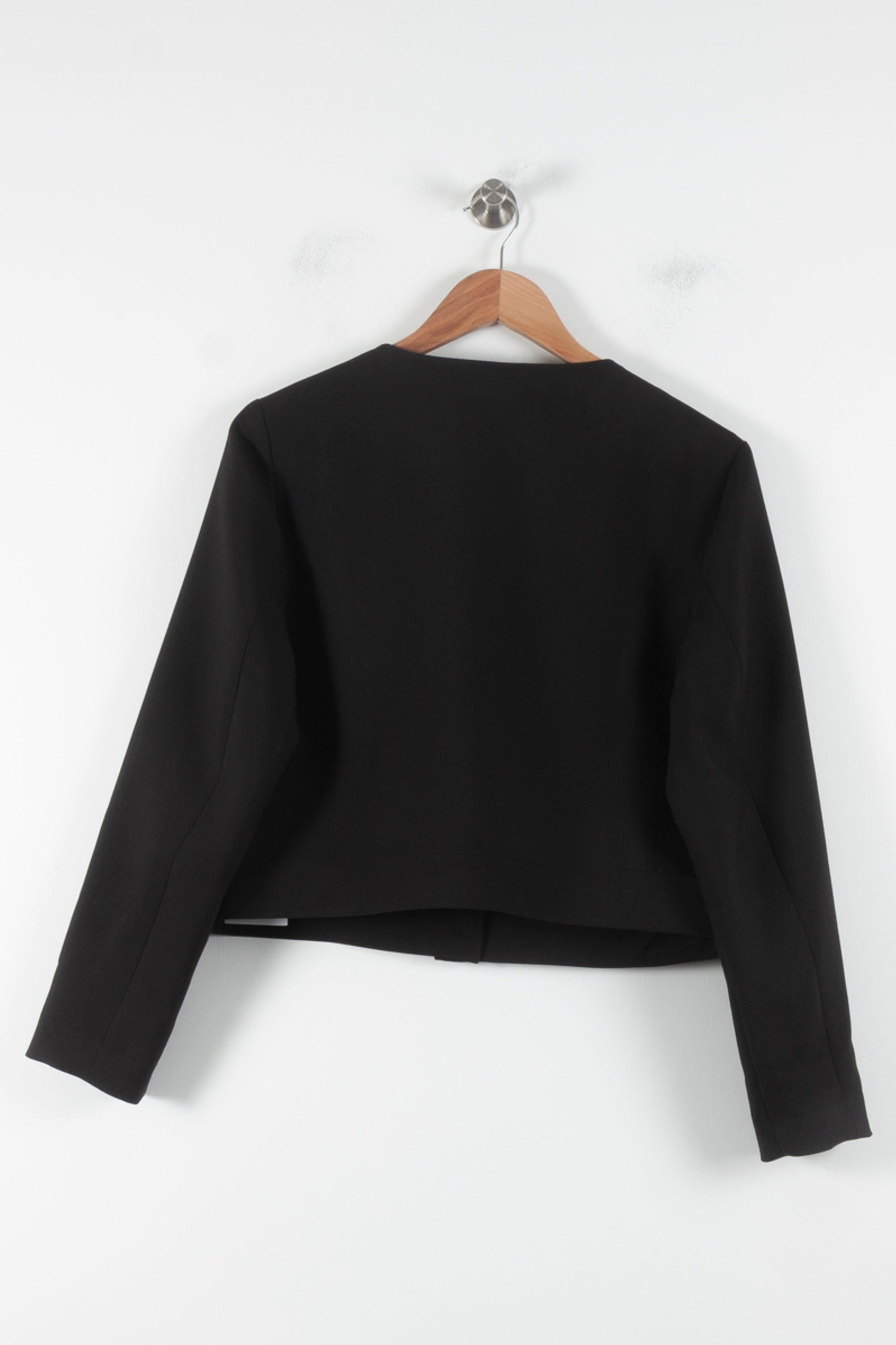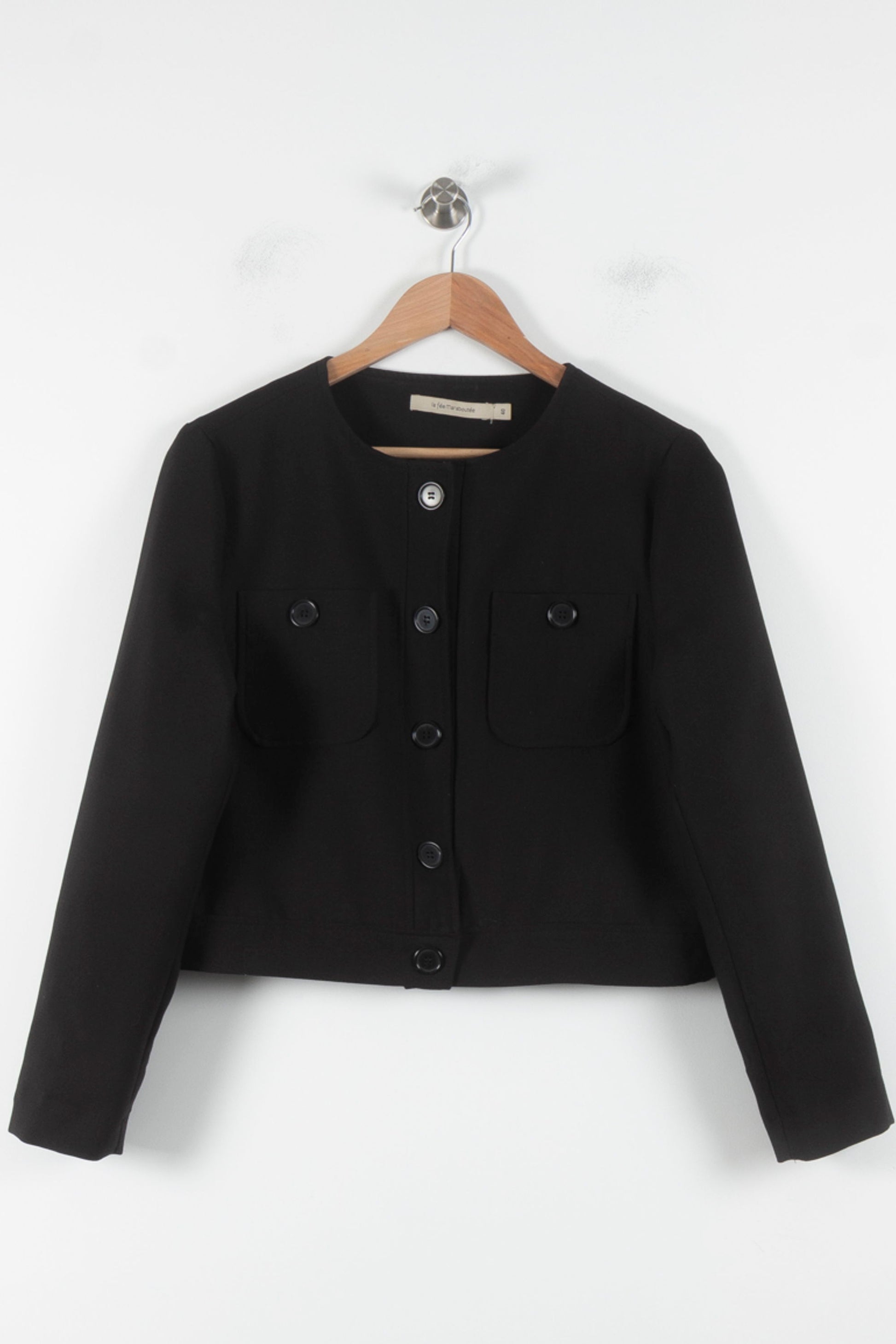 Veste noire à col rond La Fée Maraboutée, taille L/40, arborant une coupe courte élégante, fermée par une ligne de boutons et dotée de deux poches plaquées à rabat sur la poitrine. Confectionnée dans un tissu principal composé de 73% polyester, 20% viscose et 7% élasthanne, avec une doublure 100% polyester, cette pièce séduit par sa tenue structurée et ses détails sobres et raffinés, signature d’un style intemporel. Parfaite pour sublimer une tenue professionnelle ou apporter une touche chic à une sortie urbaine.