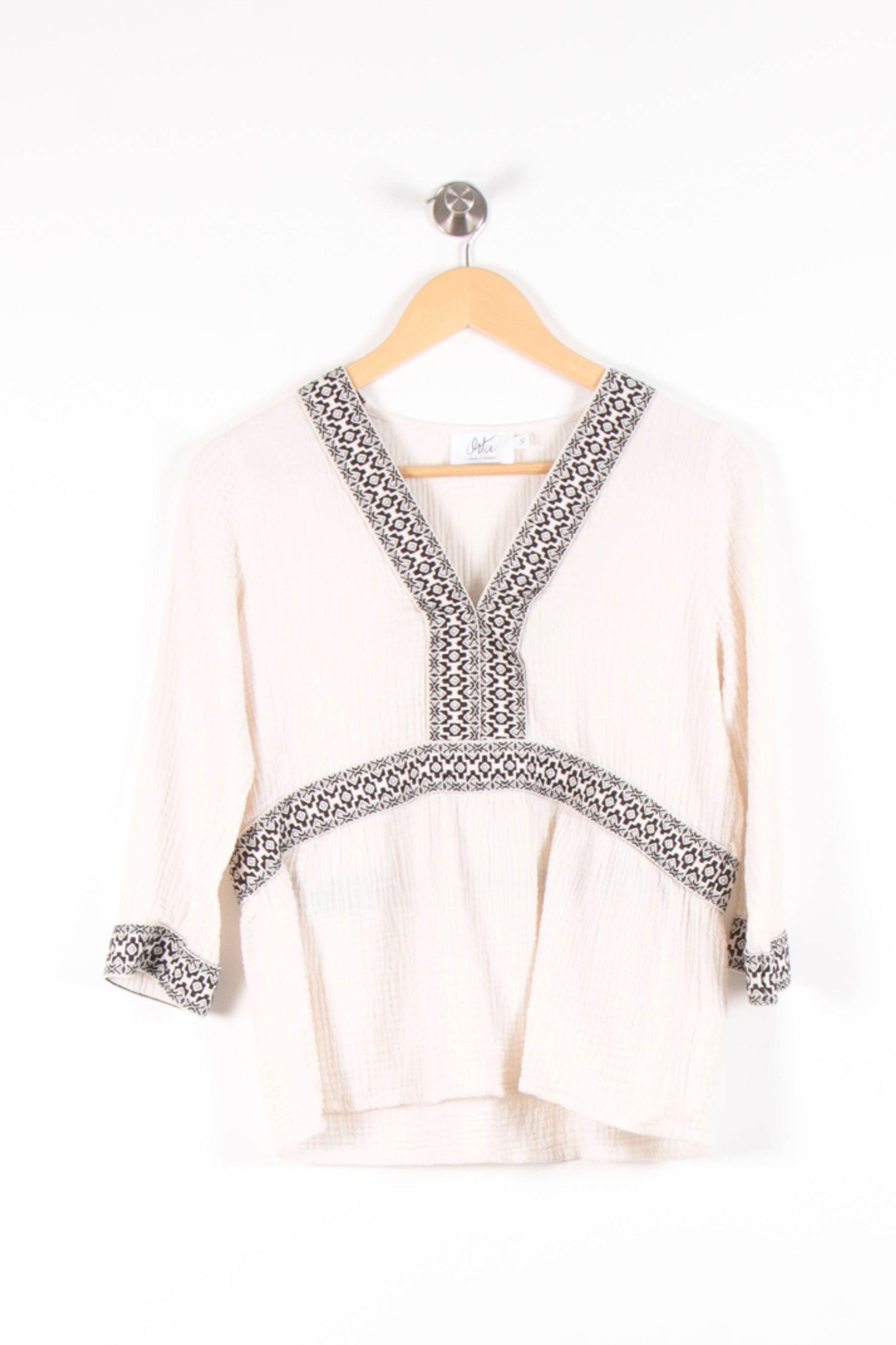 Top Orta blanc en taille S/36, à manches trois-quarts, orné de motifs géométriques noirs sur l’encolure, la taille et les poignets. La matière texturée apporte douceur et légèreté, tandis que les détails brodés confèrent à ce modèle une élégance raffinée et une grande originalité. Idéal pour une journée estivale ou un rendez-vous décontracté en terrasse.