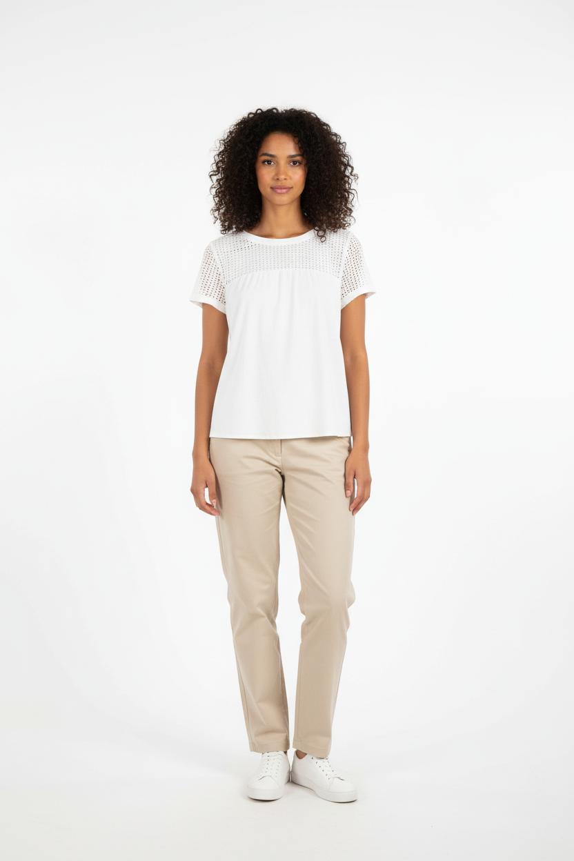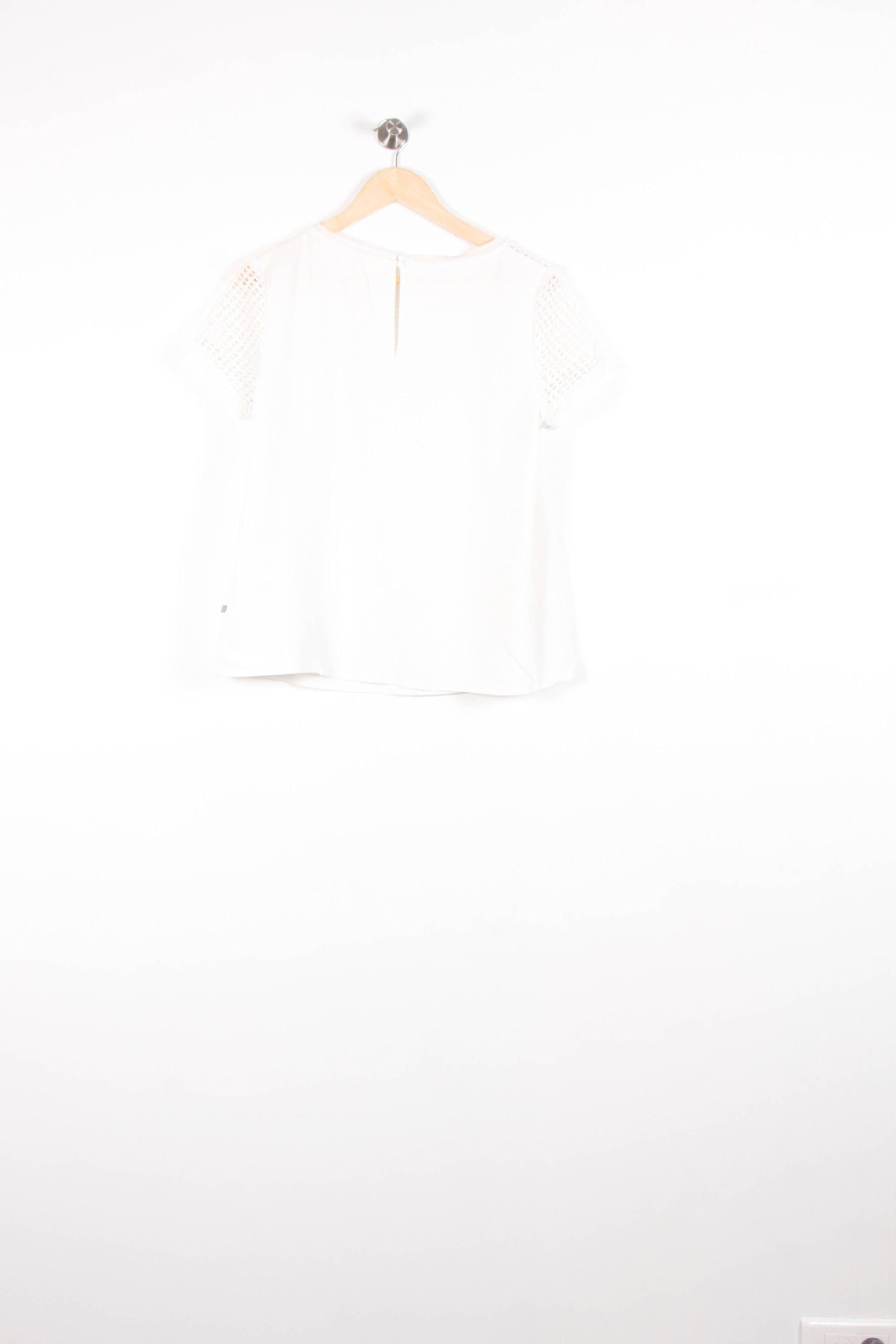 Top blanc I.Code en taille L/40, un modèle féminin alliant simplicité et élégance. La matière fluide est sublimée par des empiècements ajourés sur les épaules et le haut du buste, apportant une touche de modernité et de raffinement à ce basique revisité. Ce top sera parfait pour un déjeuner estival ou une sortie décontractée entre amis.