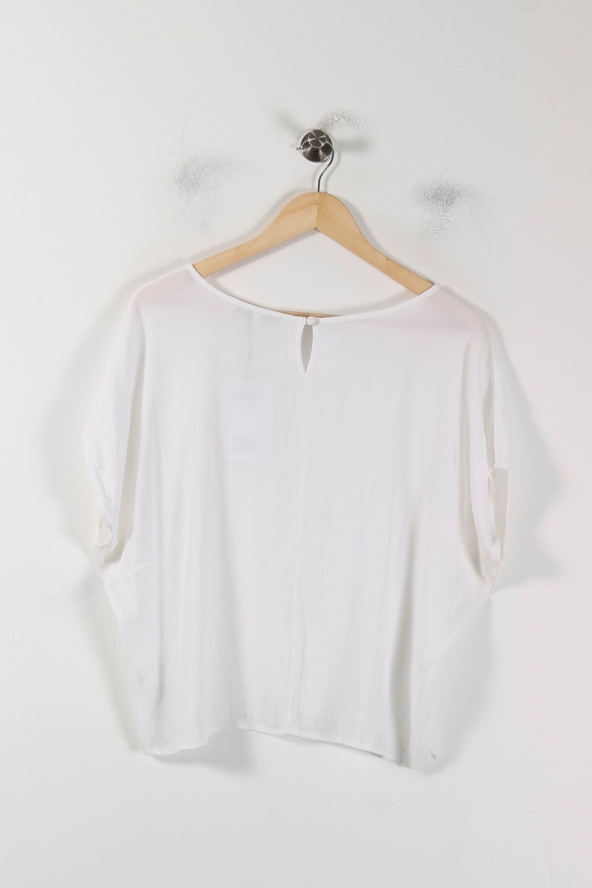 Top blanc La Fée Maraboutée, taille L/40, au design épuré et à la coupe ample. Confectionné en 100% viscose, ce top se distingue par sa matière fluide et légère ainsi que par son encolure en V et sa découpe goutte au dos, ajoutant une touche de raffinement discrète. Idéal pour un look élégant lors d’un déjeuner en terrasse ou une journée au bureau.