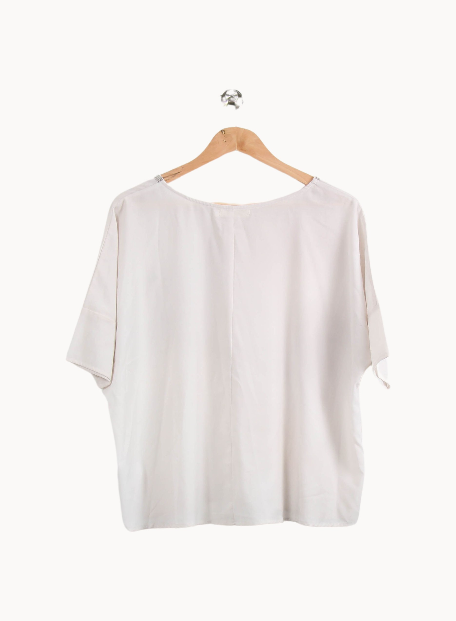 Top blanc Grace & Mila en taille L/40, à manches courtes et coupe ample. Confectionné dans une matière légère, il est agrémenté de délicats détails brodés au niveau de l’encolure et de la poche poitrine, qui lui confèrent une touche d’élégance discrète. Idéal pour une journée décontractée au bureau ou un déjeuner entre amis.