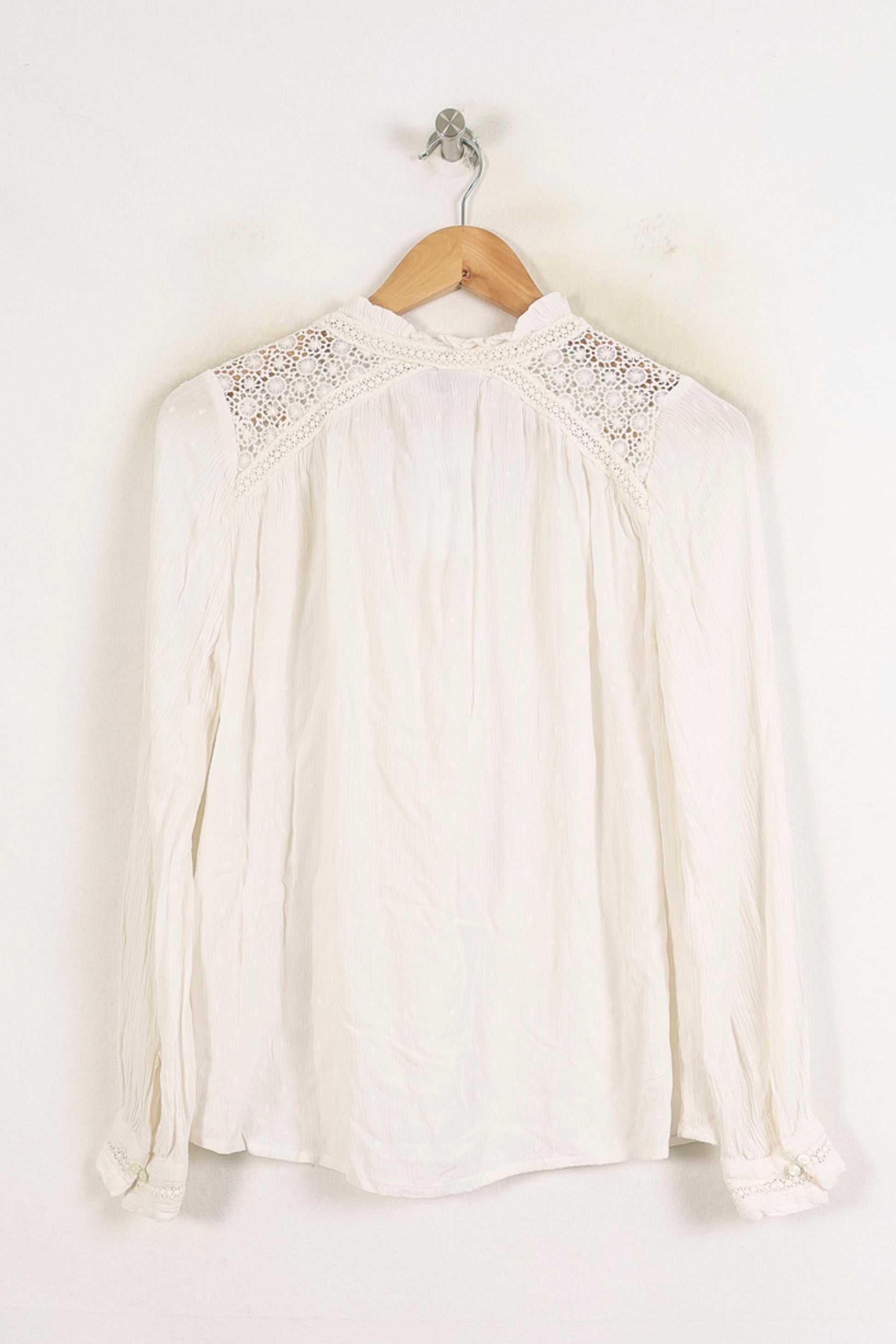 Blouse blanche Caroll à manches longues, taille M/38, confectionnée dans un tissu léger et fluide, parfaite pour un look chic et intemporel. Ce haut se distingue par son encolure ronde délicatement volantée, ses empiècements en dentelle ajourée sur les épaules et sa finition soignée aux poignets, apportant originalité et raffinement. Idéale pour une journée au bureau ou un déjeuner élégant entre amis.