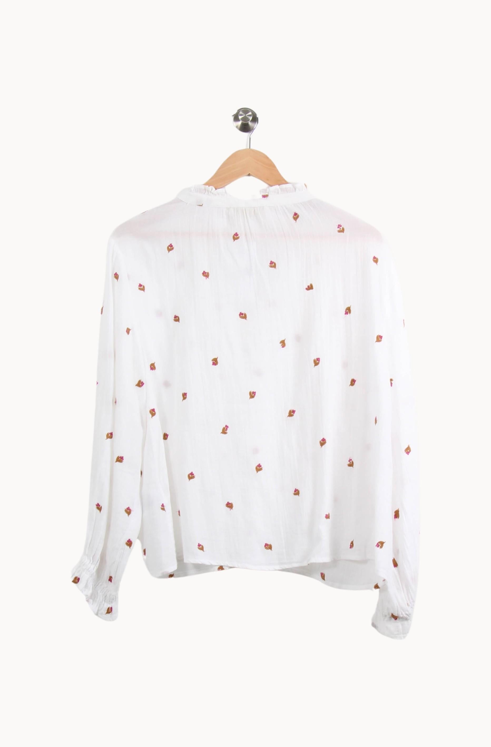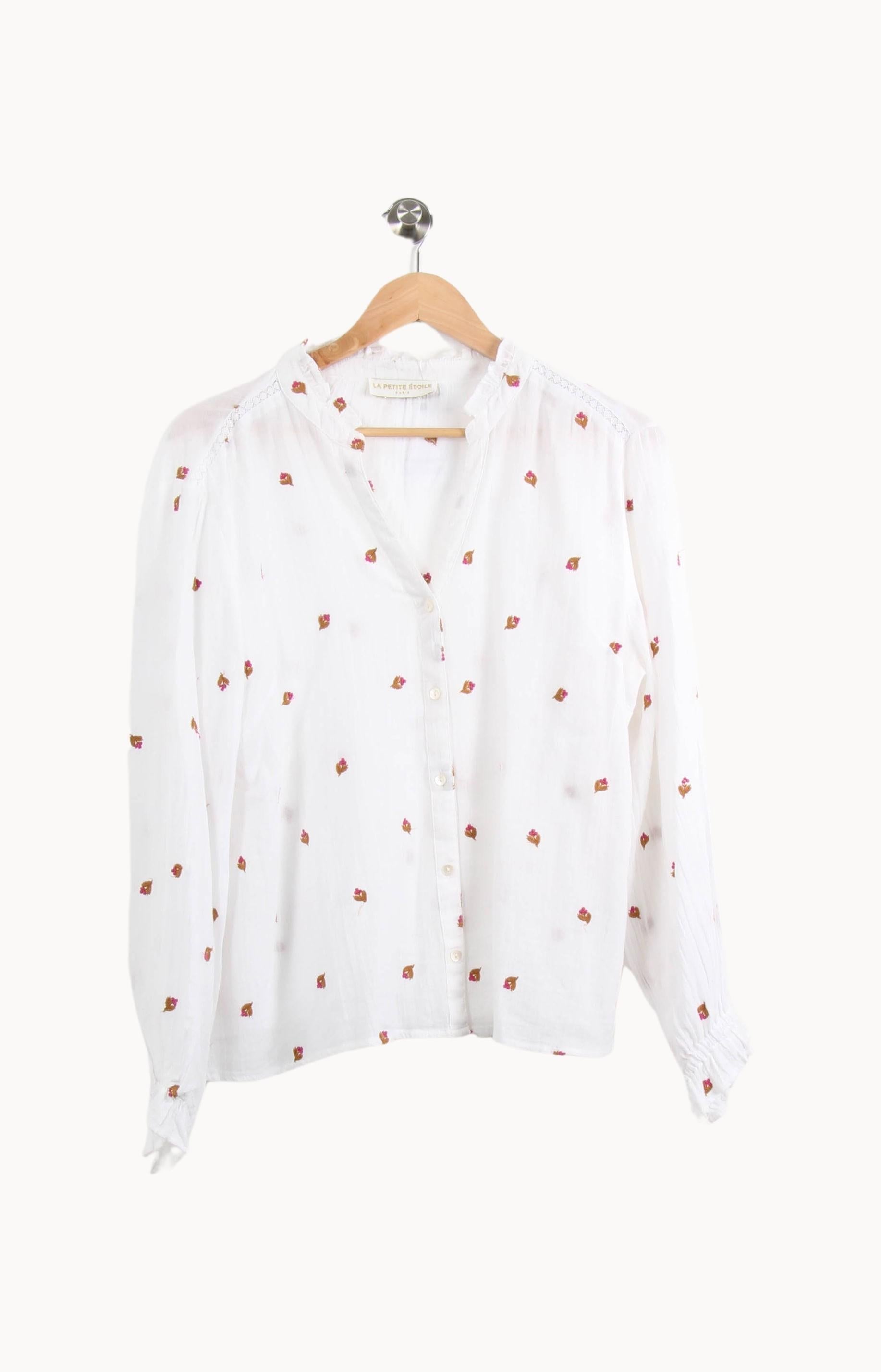 Blouse blanche à motifs fleuris La Petite Etoile, taille S/36, élégante et intemporelle, parfaite pour sublimer vos tenues du quotidien. Confectionnée dans une matière légère et aérée, elle se distingue par ses délicats motifs floraux brodés rouges et dorés, sa patte de boutonnage discrète et ses poignets travaillés, pour une touche raffinée et unique. Idéale pour une journée au bureau ou un déjeuner en terrasse, cette blouse allie confort et style avec simplicité.