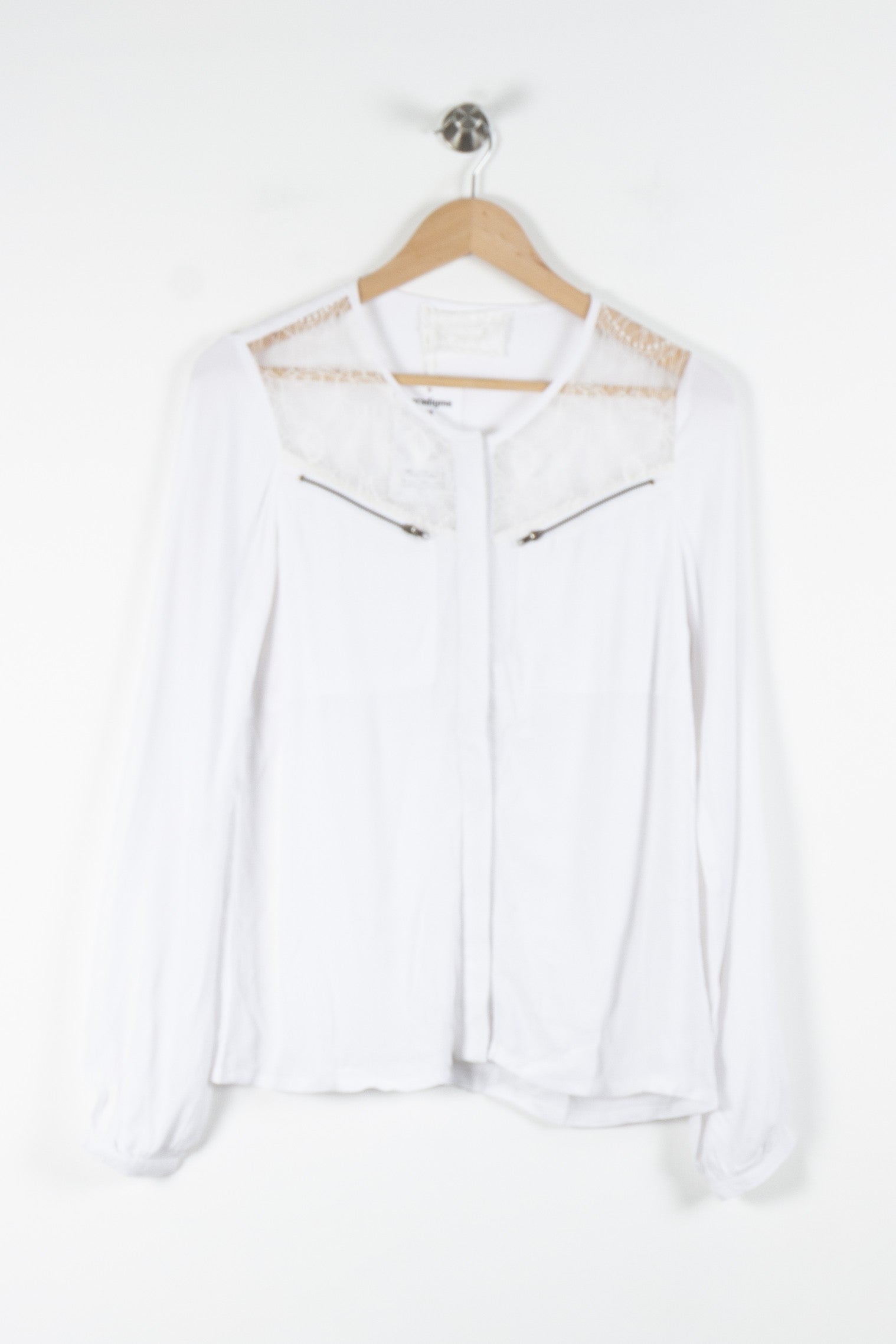 Top blanc Suncoo T.U. : ce haut élégant à manches longues de la marque Suncoo, en taille unique, se distingue par sa couleur blanche intemporelle et son style raffiné. La partie supérieure est délicatement ornée de dentelle transparente et de deux zips décoratifs, apportant une touche féminine et moderne qui rend ce vêtement unique. Parfait pour une réunion professionnelle ou un déjeuner chic entre amis.