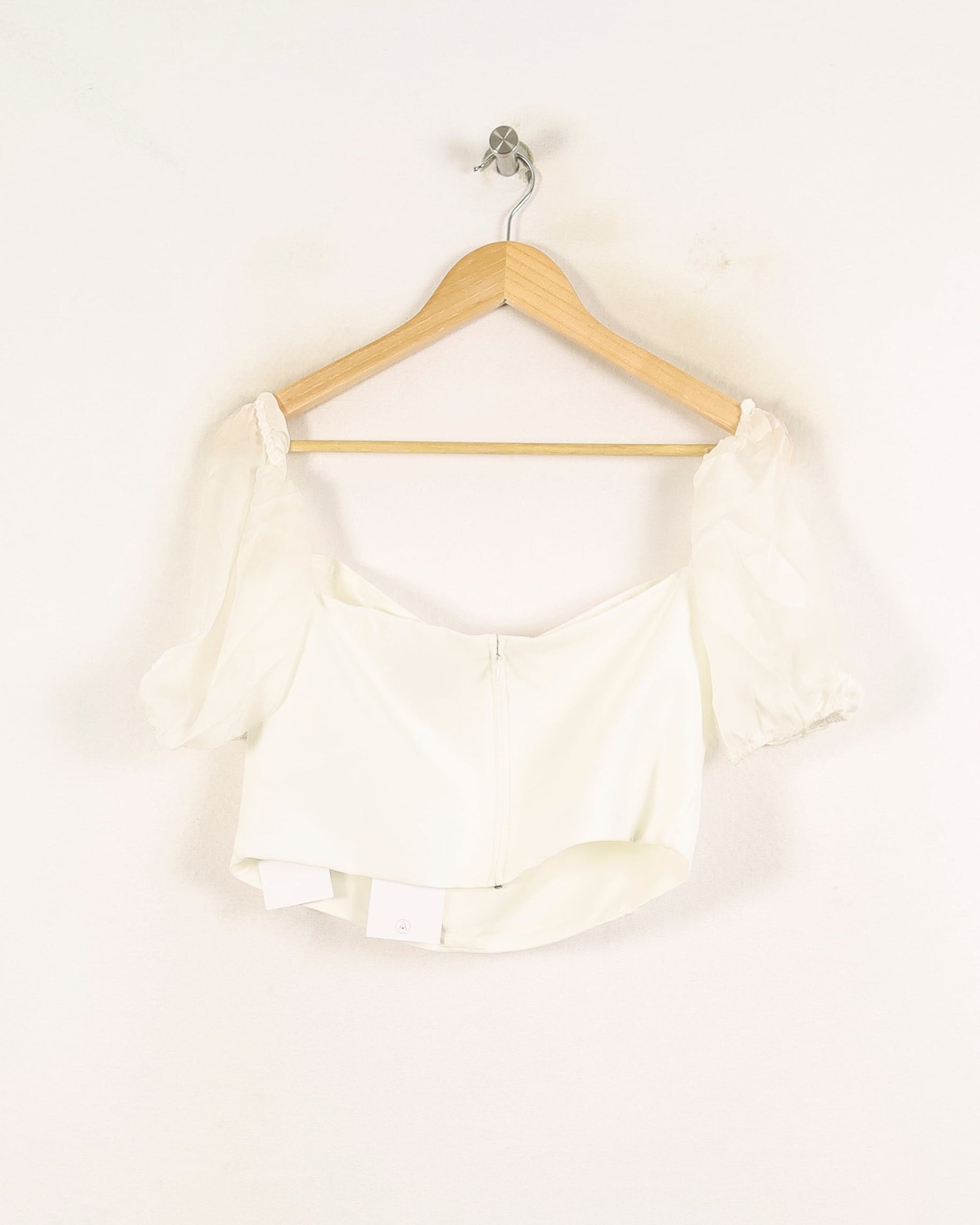 Top blanc Maison Lemoine, taille XL/42, alliant élégance et modernité pour sublimer votre silhouette. Confectionné dans une matière satinée, ce top se distingue par ses manches courtes bouffantes et son jeu de fronces délicates sur le devant, apportant une touche raffinée et originale. Idéal pour un événement chic, une cérémonie ou un dîner élégant.