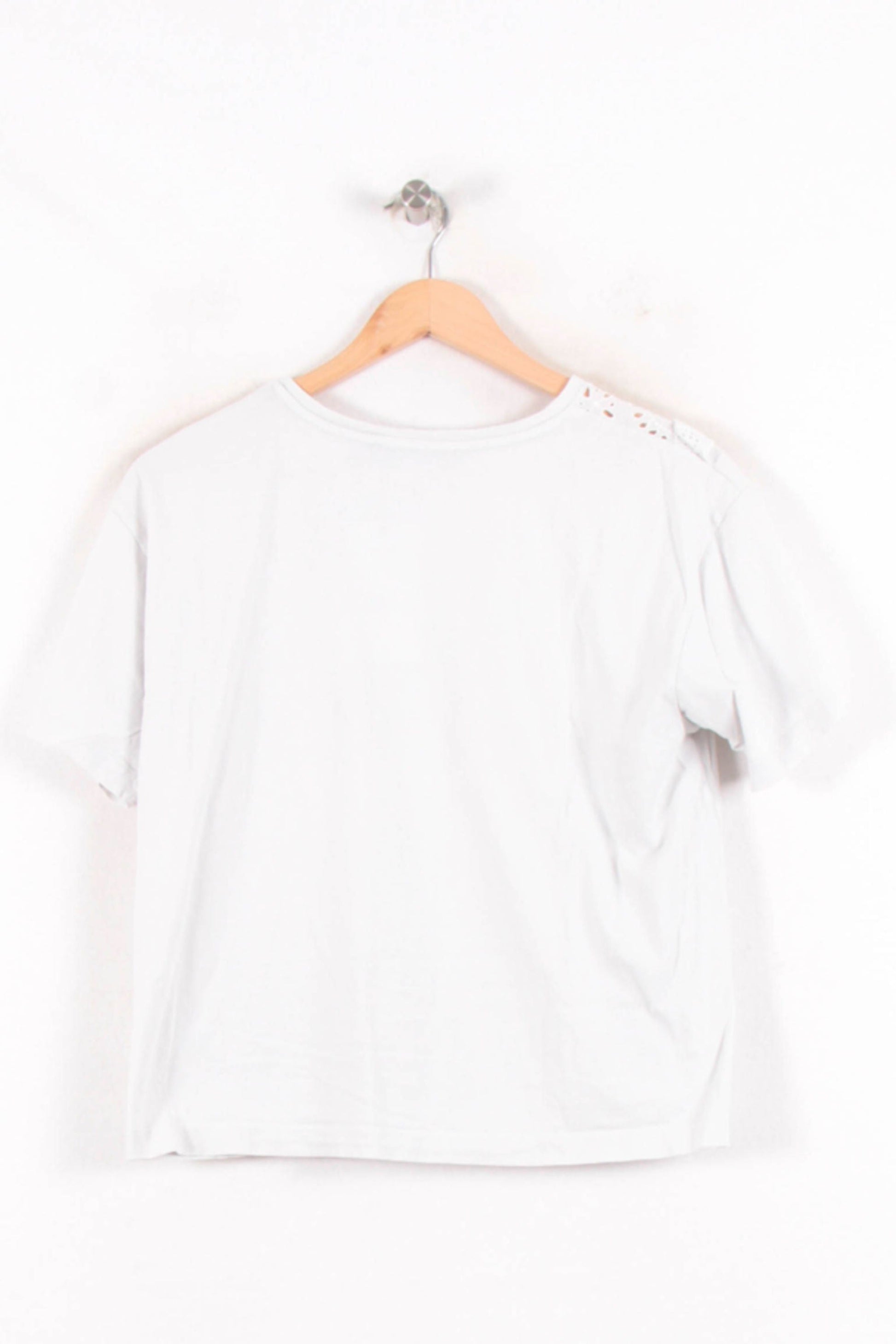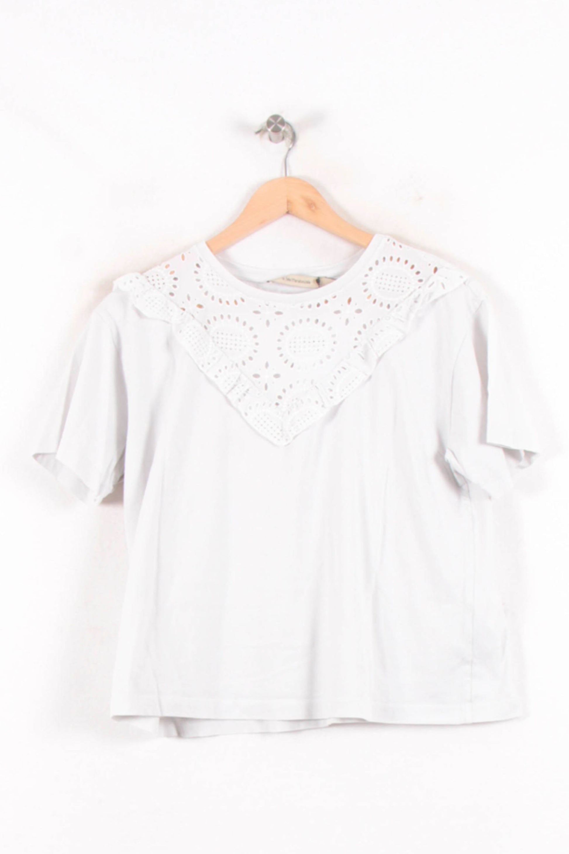 Top blanc La Fée Maraboutée, taille XS/34, une pièce élégante de la marque reconnue pour son style raffiné. Ce haut arbore une matière fluide et légère, sublimée par une incrustation de broderie anglaise ajourée sur le haut du buste, apportant une touche d’originalité et de délicatesse. Idéal pour une journée d’été, il se porte aisément lors d’un déjeuner en terrasse ou d’une sortie citadine chic.