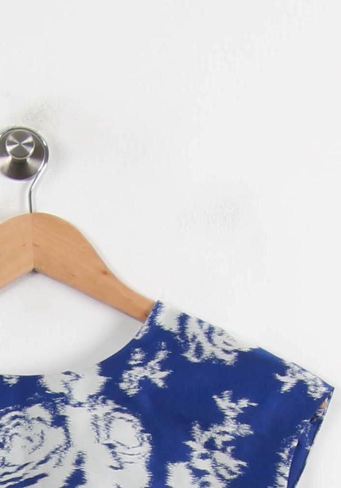 Top multicolore à motif floral signé Gerard Darel, taille S/36. Confectionné dans une matière à l’aspect satiné, ce top présente un imprimé floral bleu et blanc, des manches courtes et se distingue par ses liens à nouer à la taille pour une silhouette élégante et structurée. Parfait pour une soirée estivale ou un événement chic, associé à un pantalon blanc et des accessoires raffinés.