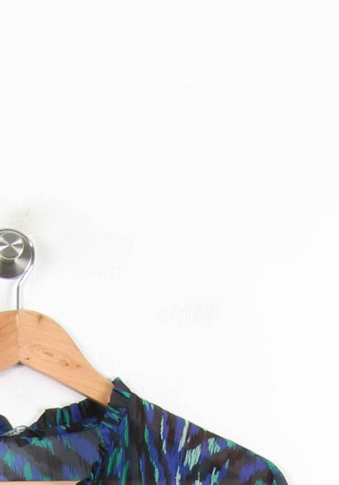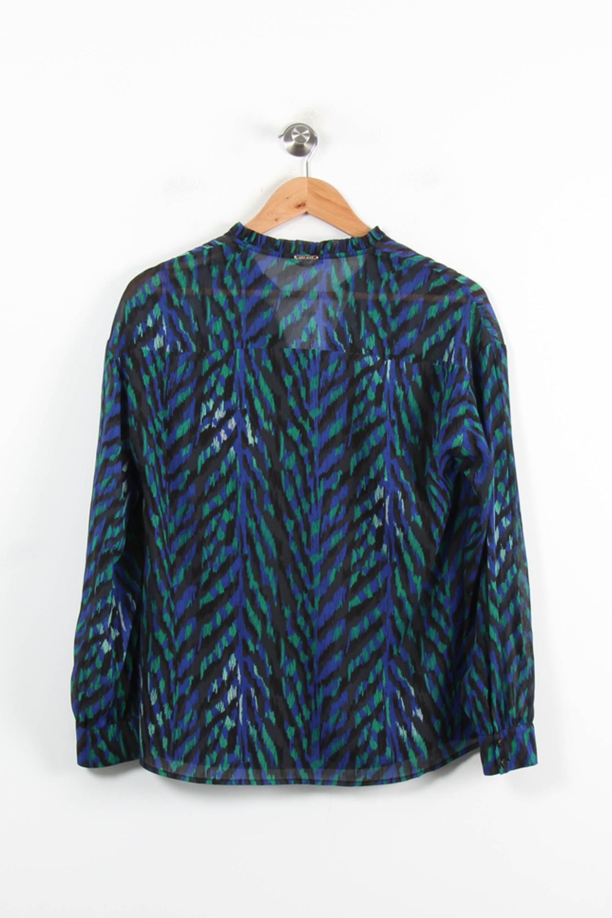 Blouse imprimée bleu One Step, taille L/40, élégante et moderne, parfaite pour sublimer votre dressing. Sa matière fluide et légère met en valeur un motif graphique bleu et vert unique, avec un subtil jeu de transparence et un col tunisien délicatement plissé, offrant raffinement et originalité à cette pièce. Idéale pour une journée de travail associée à un pantalon chic, ou pour un dîner en ville portée avec un jean et des accessoires élégants.