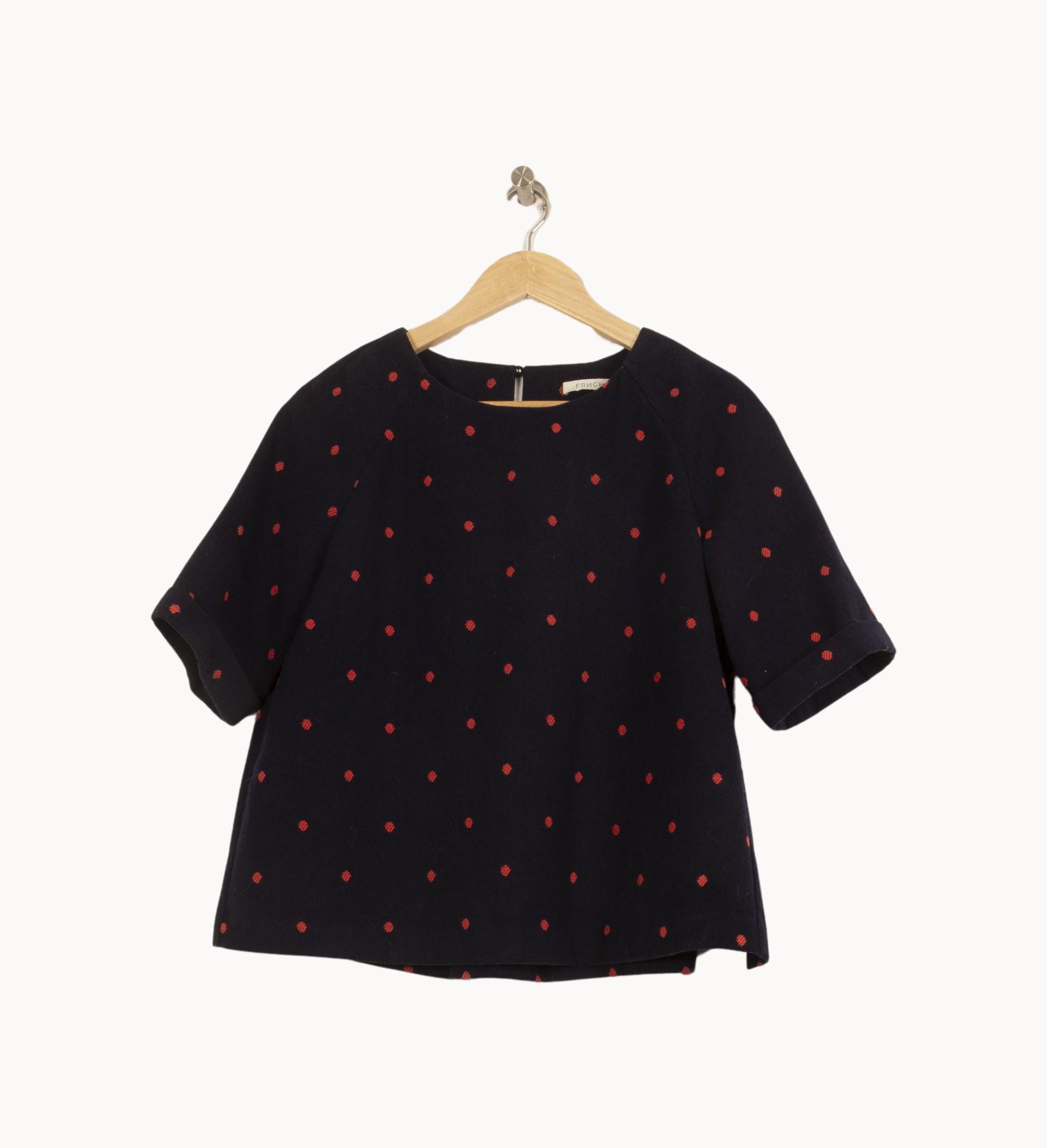 Top bleu à pois rouges FRNCH, taille M/38 : un vêtement moderne et élégant à la coupe droite, signé par la marque FRNCH. Confectionné dans une matière douce et structurée, ce top se distingue par ses manches courtes et son motif de petits pois rouges réguliers, apportant une touche graphique et sophistiquée à la pièce. Ce modèle est idéal pour un déjeuner chic entre amies ou une sortie citadine.