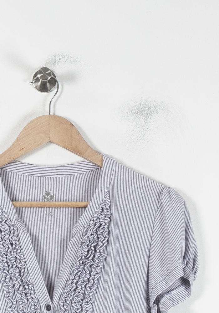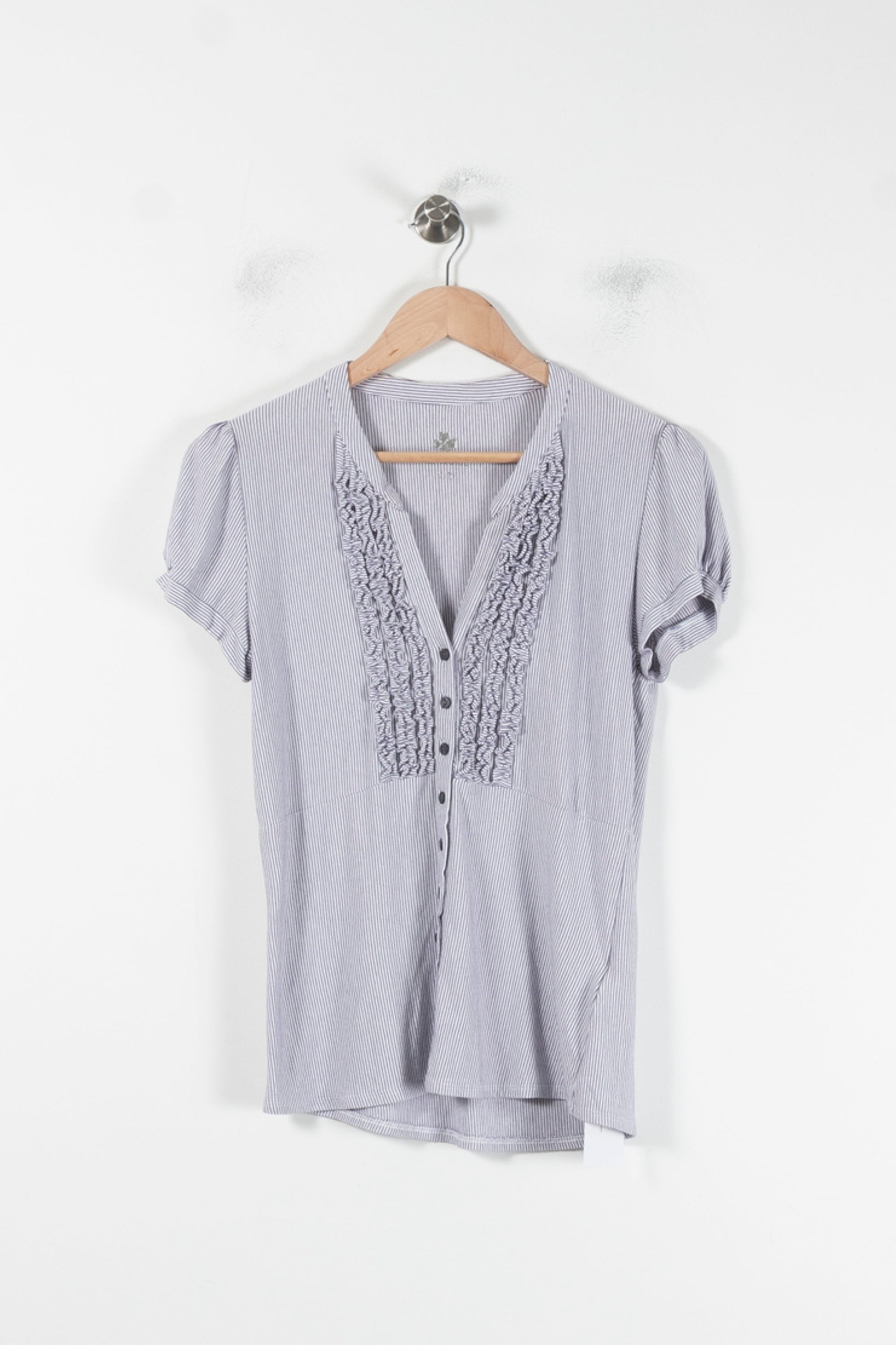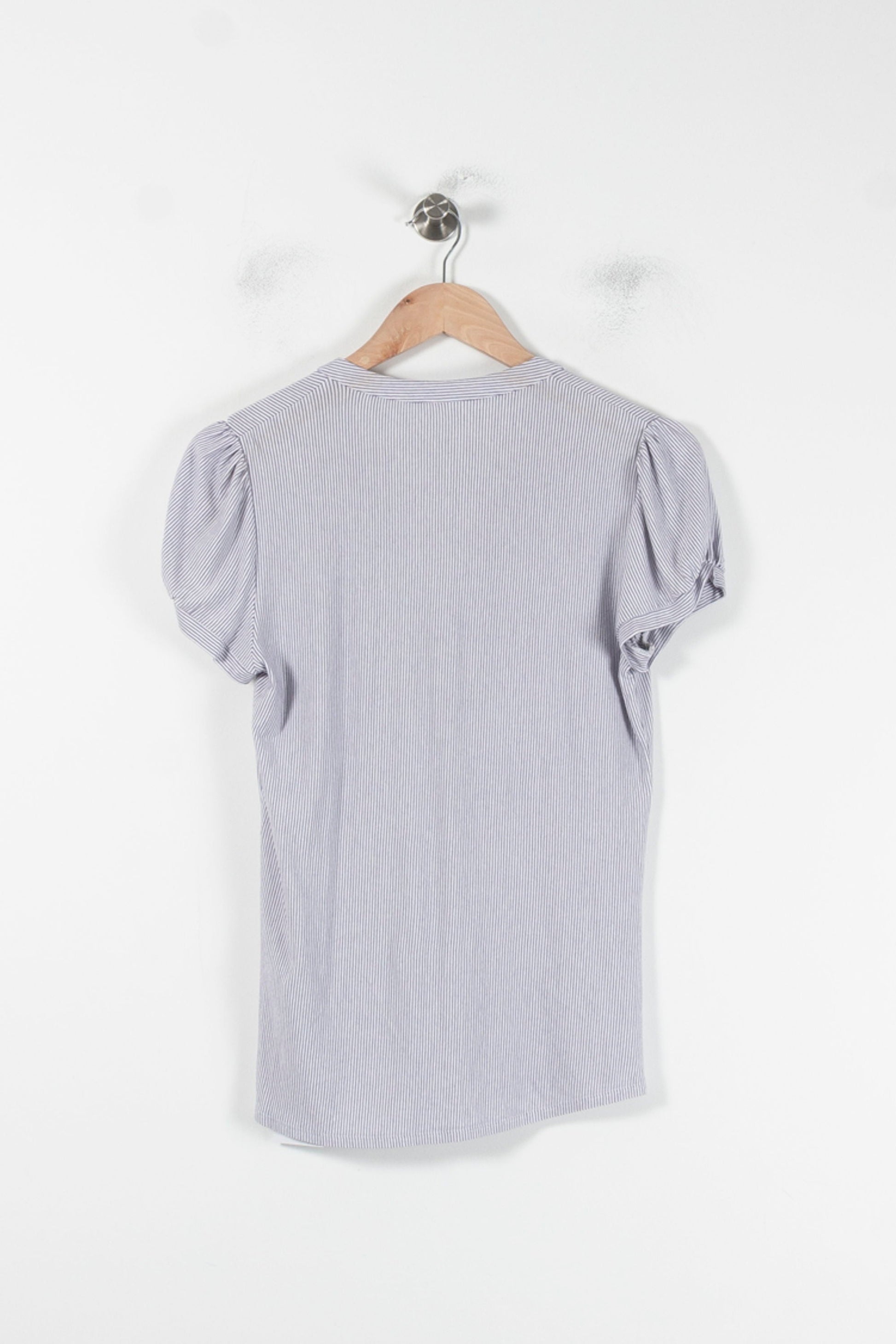 Blouse bleu à manches courtes Caroll, taille L/40, élégante avec liserés et détails de volants sur le devant. Confectionnée en 96% viscose et 4% élasthanne, cette pièce fluide se distingue par ses fines rayures et ses boutons apparents, offrant confort et originalité à votre dressing. Idéale pour une journée de travail estivale ou un déjeuner en ville.