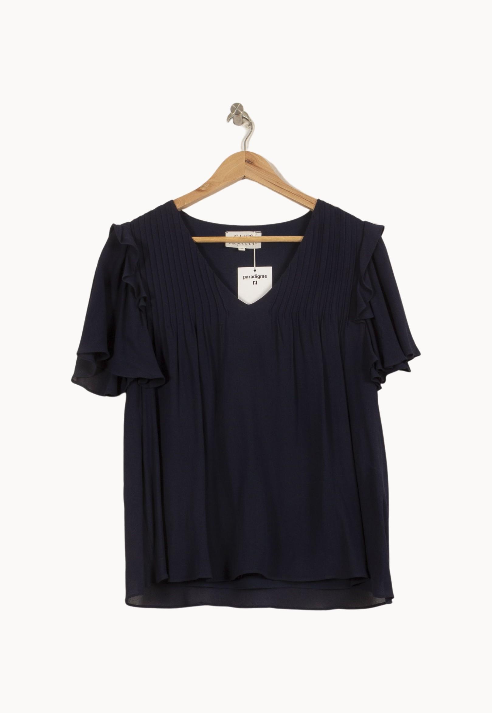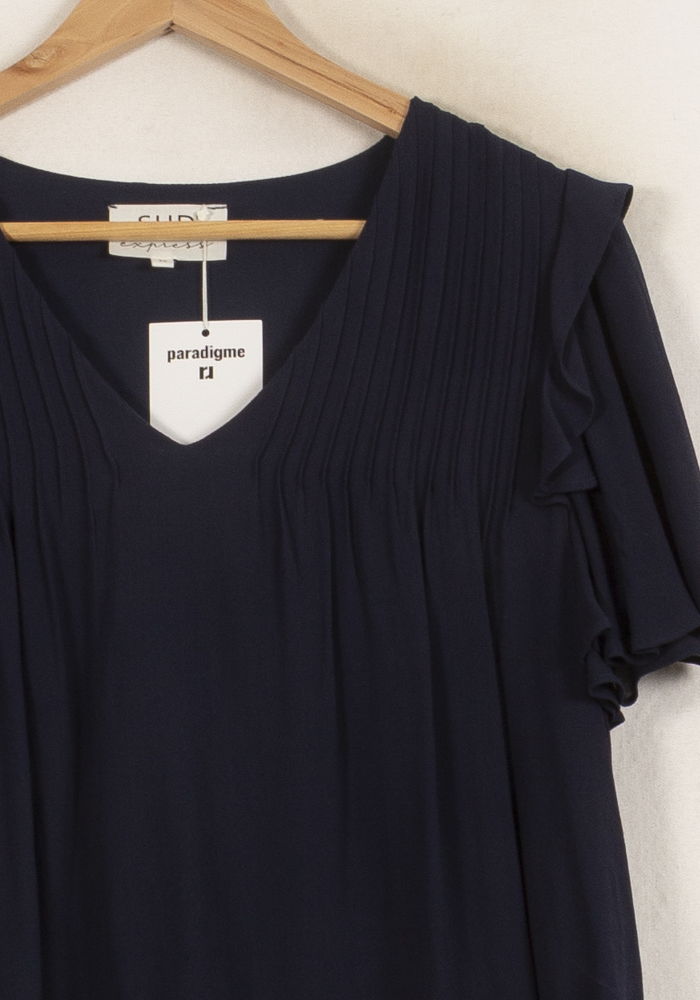 Top bleu Sud Express, taille M/38, à la coupe fluide et au col en V, alliant élégance et modernité. Confectionné dans une matière légère, ce haut se distingue par ses manches courtes volantées et ses détails de plis plats sur le buste, offrant une finition raffinée et sophistiquée. Idéal pour une journée au bureau ou un dîner entre amis, il s'adapte parfaitement à toutes les occasions.