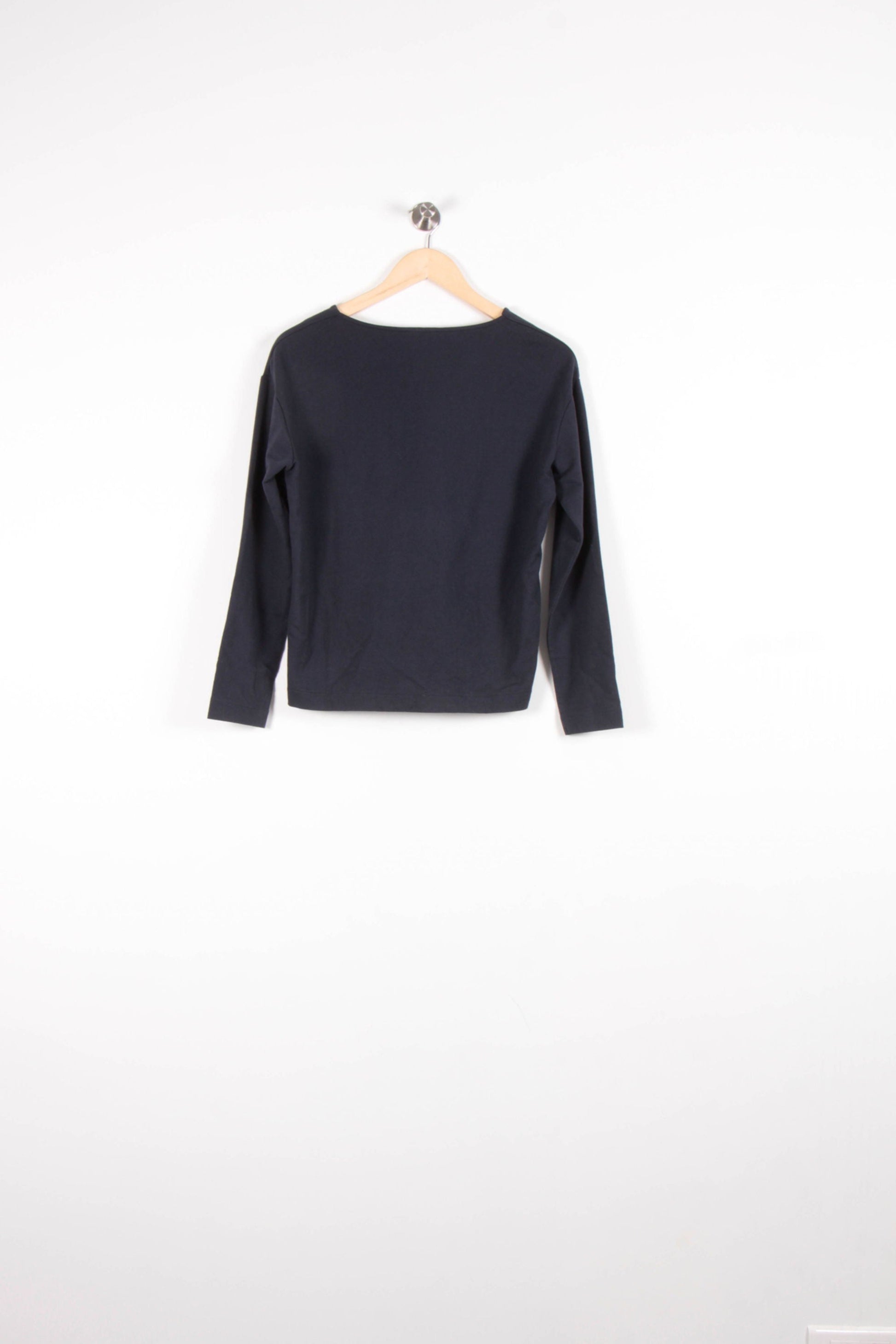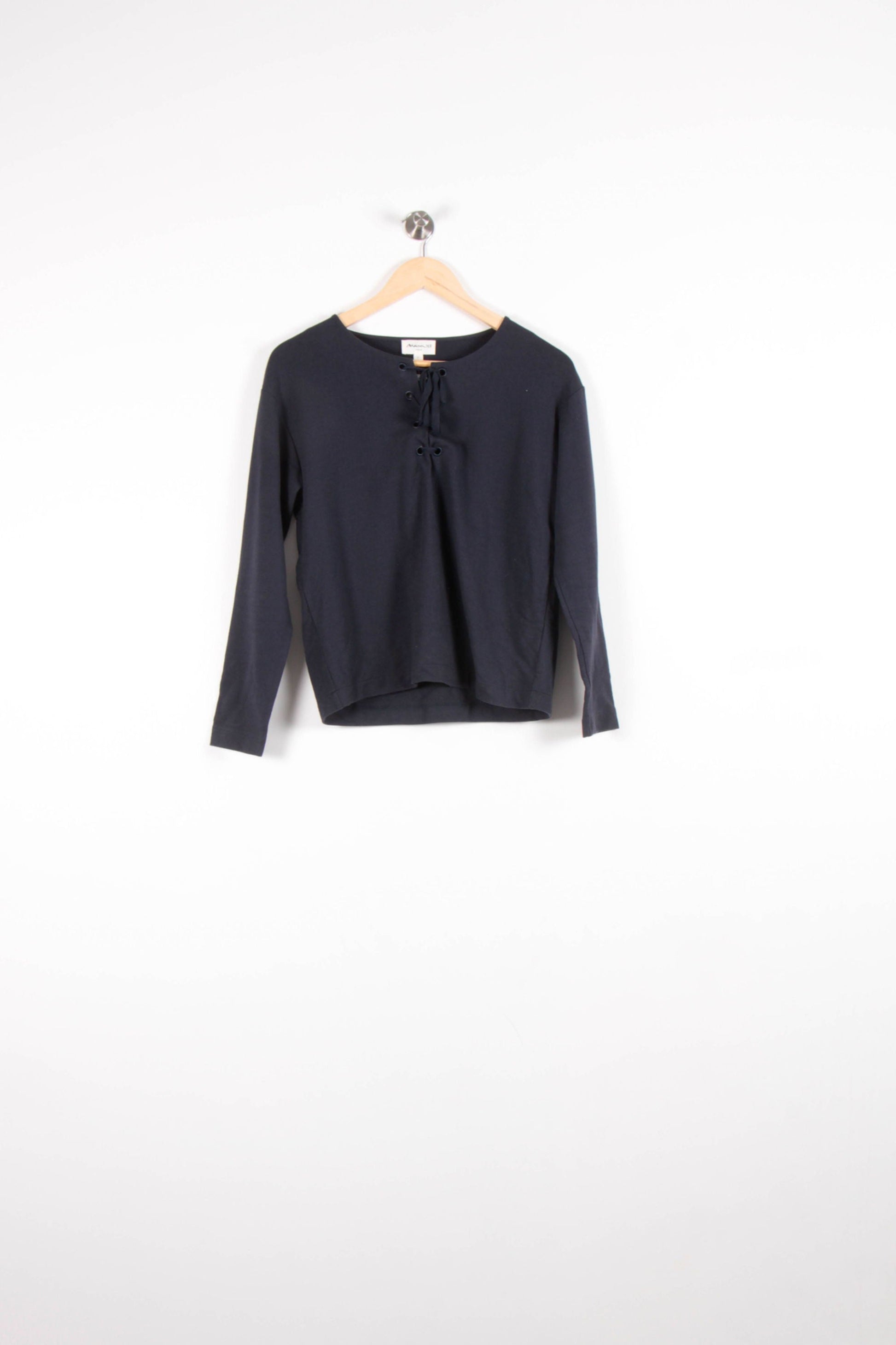 Top bleu à manches longues Maison 123, taille S/36. Confectionné dans une matière douce, ce top se distingue par son encolure ronde agrémentée d’un élégant laçage à œillets métalliques qui lui apporte une touche raffinée. Ce modèle sera parfait pour une journée de travail ou une sortie décontractée.