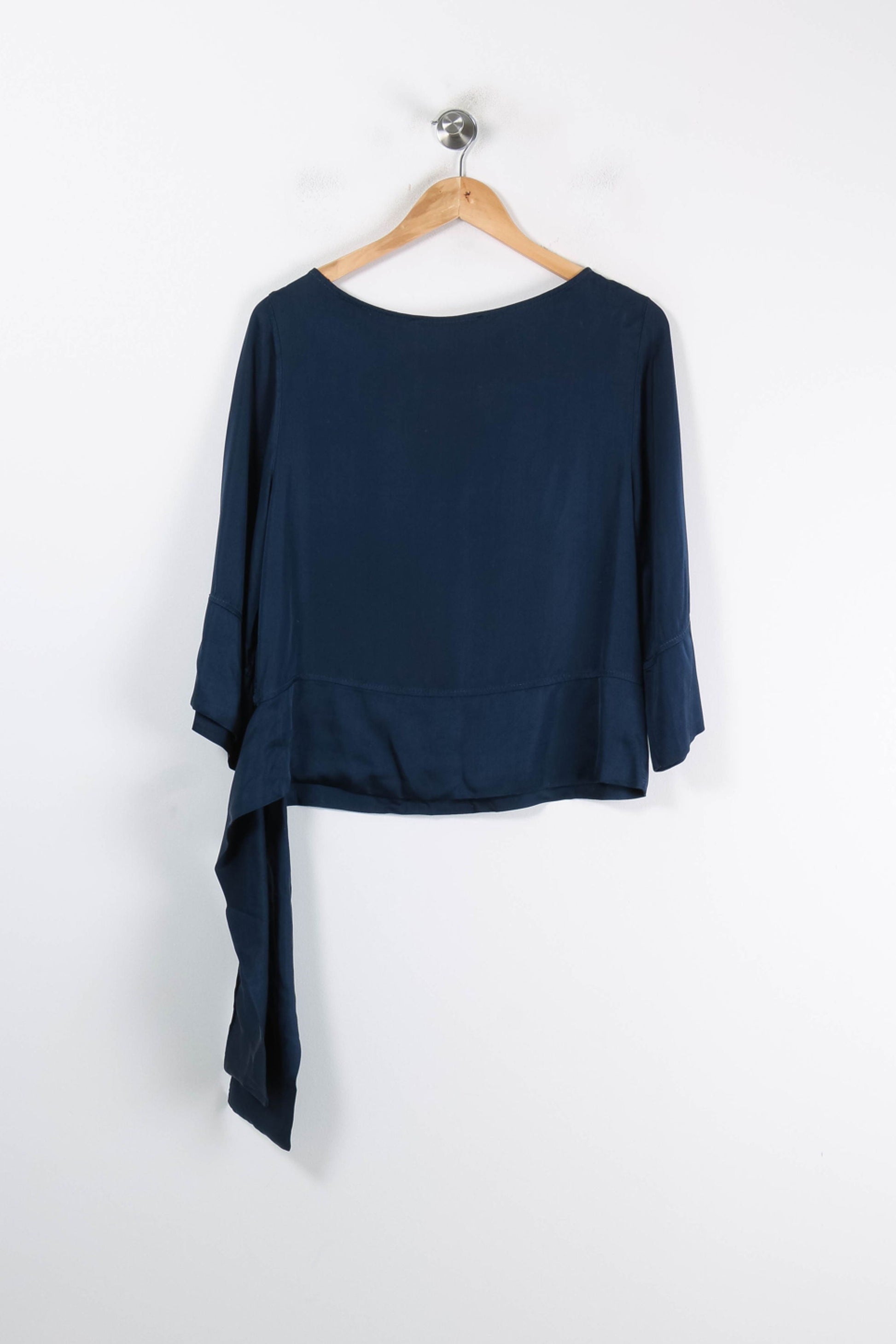 Top bleu La Fée Maraboutée taille S/36, à manches longues, coupe ample et détail original par une extension asymétrique du tissu sur le côté. Confectionné en 100% viscose, il offre une texture fluide et douce au toucher ; la coupe moderne et le détail drapé apportent une touche singulière et élégante. Idéal pour une journée de travail ou un dîner raffiné, il se distingue par sa sobriété et son raffinement.