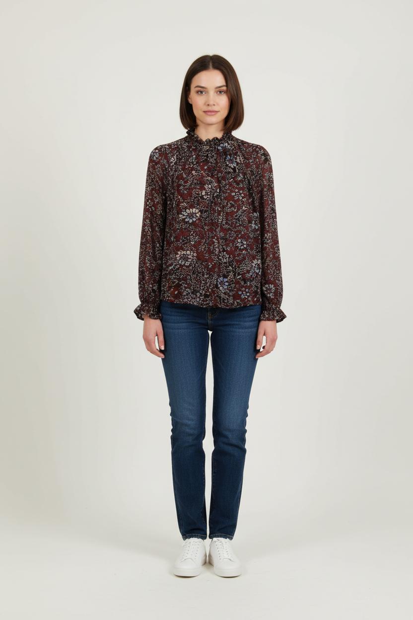 Blouse imprimé bordeaux ba&sh, taille M/38, élégante et féminine. Confection en matière fluide, un chemisier orné d'un motif floral raffiné dans des tons de bleu, beige et noir, avec une finition volantée et des bords smockés, pour une touche d'originalité et une silhouette délicate. Idéal pour une journée de voyage ou un dîner élégant, une allure et un contrat sublimes et chics.