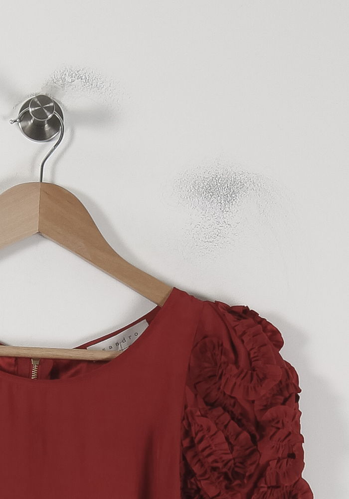 Top Sandro bordeaux, taille M/38, avec détails plissés. Confiserie et 100% soie, la qualité de la texture fluide et l'élégance du matériau, sublimées par la riche décoration des structures volantes pour une touche de sophistication. Idéal pour une réception élégante ou un dîner raffiné, pour une allure et un confort optimaux dans votre tenue.
