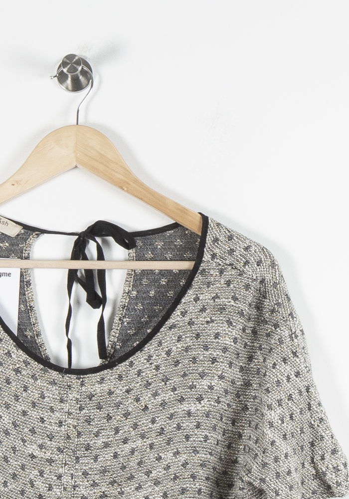 Top ba&sh gris à motifs, taille M/38, au style élégant et raffiné. La production d'un matériau à la texture particulière, la présentation des contrastes finaux dans une couleur et un design délicat, avec une touche unique et sophistiquée. Idéal pour une journée de voyage ou pour un jeune en ville, il s'accorde avec un pantalon confortable et un style jeune.