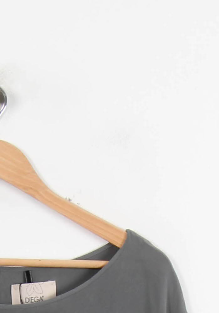 Top ample gris Diega, taille S/36, à la coupe épurée et encolure ronde. Confectionnée dans une matière légère et fluide, la finition haut de gamme est réalisée par la sobriété des lignes et le tombé élégant des manches courtes, ajoutant une touche de sophistication à la silhouette. Idéal pour une journée de voyage ou pour finaliser un contrat, à porter avec un pantalon ou un jean.
