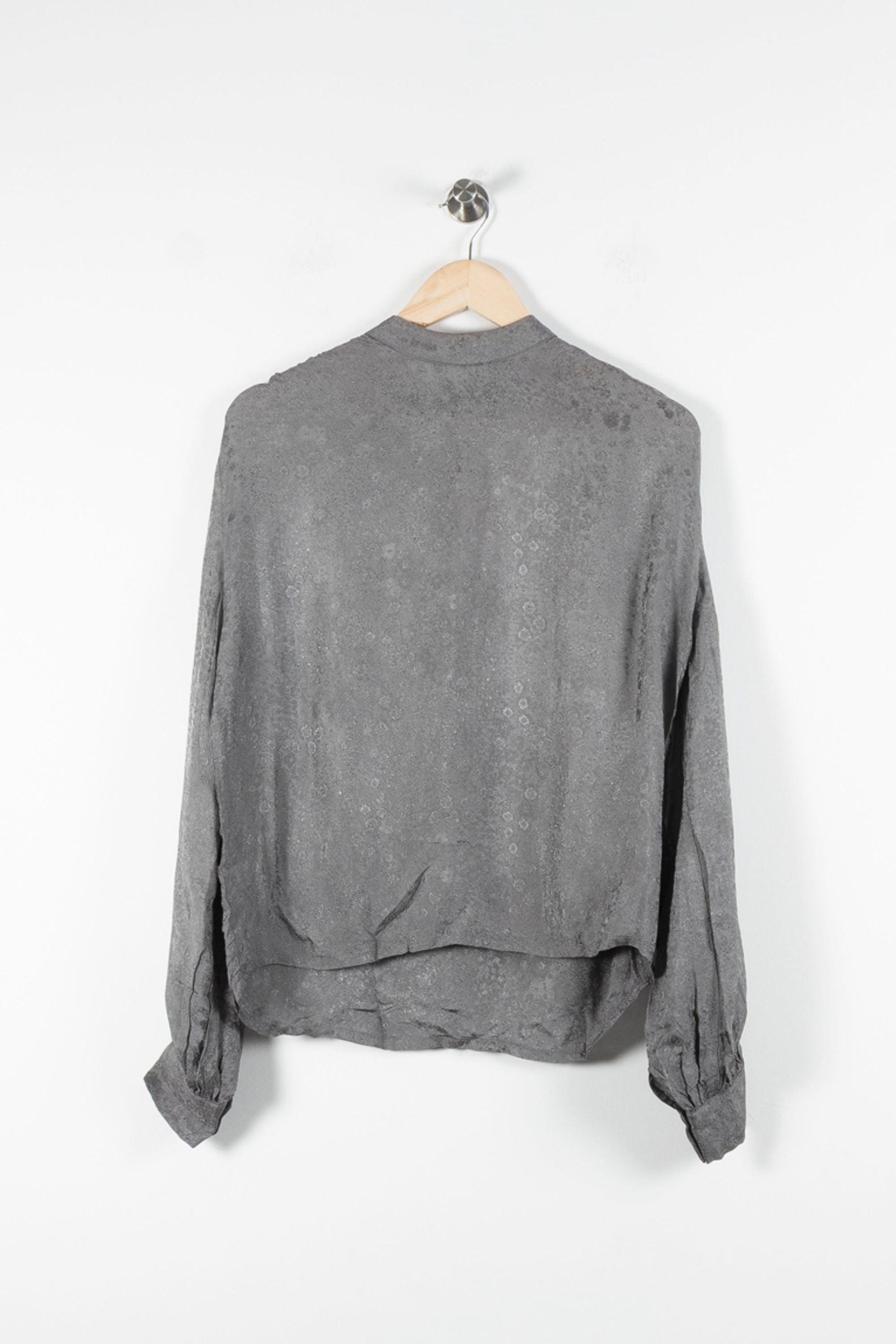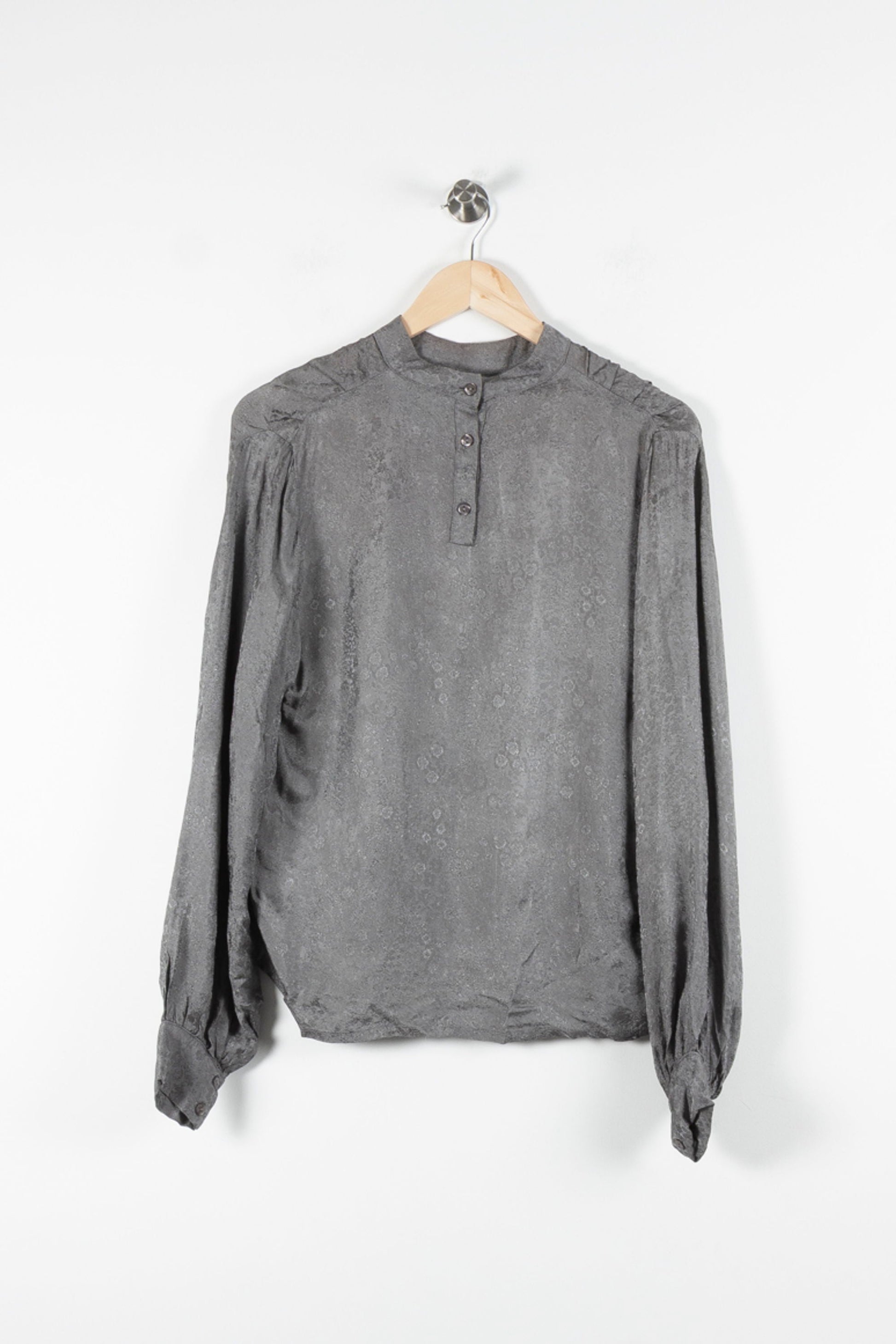 Blouse Fashion trotter grise à manches longues, taille S/36, au style épuré et élégant. Confectionnée en viscose 100%, la blouse présente un toucher doux avec une texture discrète ton sur ton, une combinaison de boutonnières et de détails délicats sur les épaules, une sophistication attrayante et un caractère à la pièce. Idéal pour une réunion professionnelle avec un dîner raffiné, s'adaptant à un style contemporain.