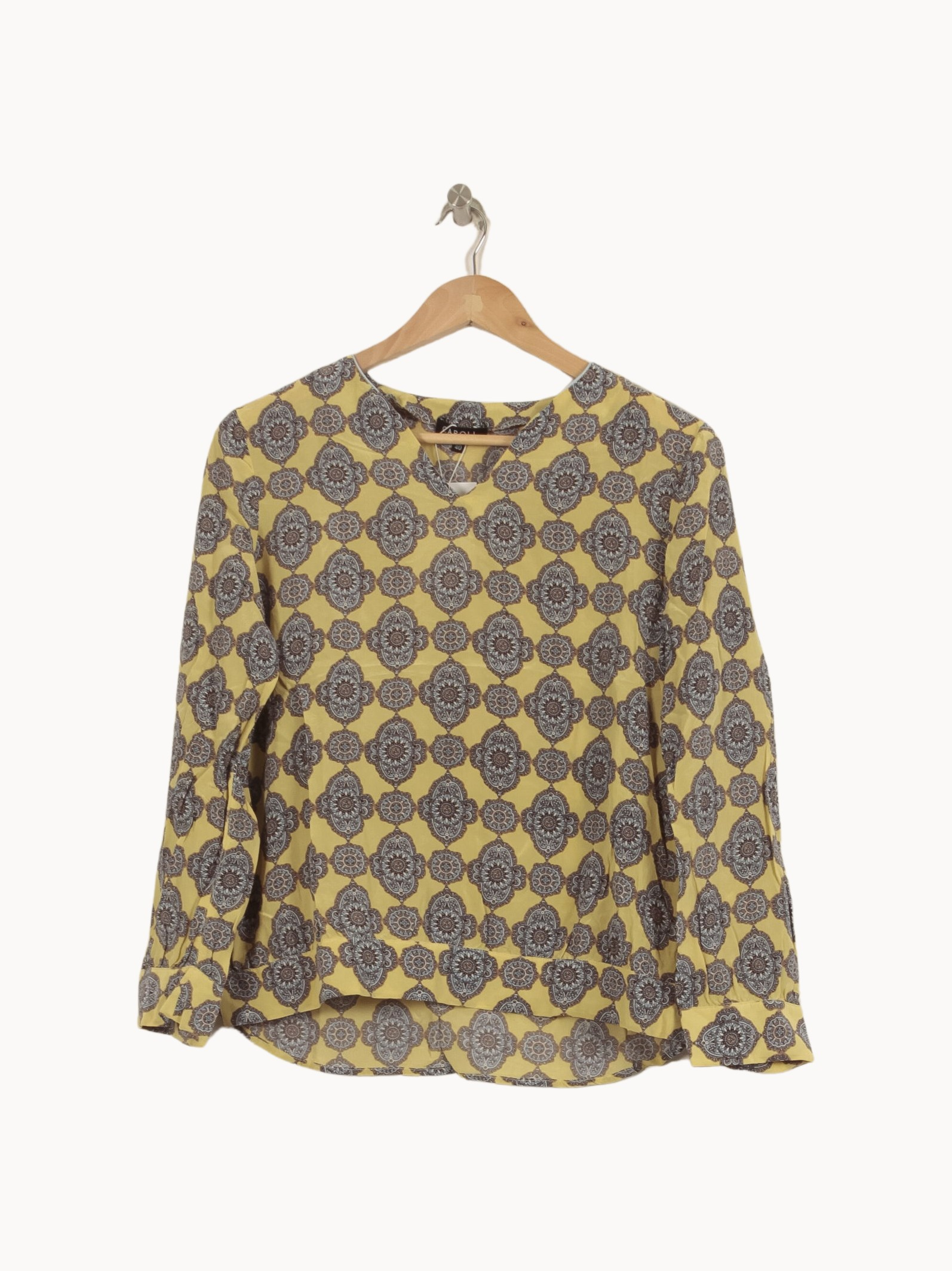 Top imprimé jaune Caroll, taille L/40, mettant en valeur un motif graphique élégant sur fond lumineux. Confectionné dans une matière fluide, ce haut à manches longues se distingue par ses motifs floraux géométriques et son encolure ronde, offrant une allure raffinée et originale. Idéal pour une journée au bureau ou une sortie décontractée entre amis, il s’associera aisément à un pantalon sobre pour un look chic et moderne.