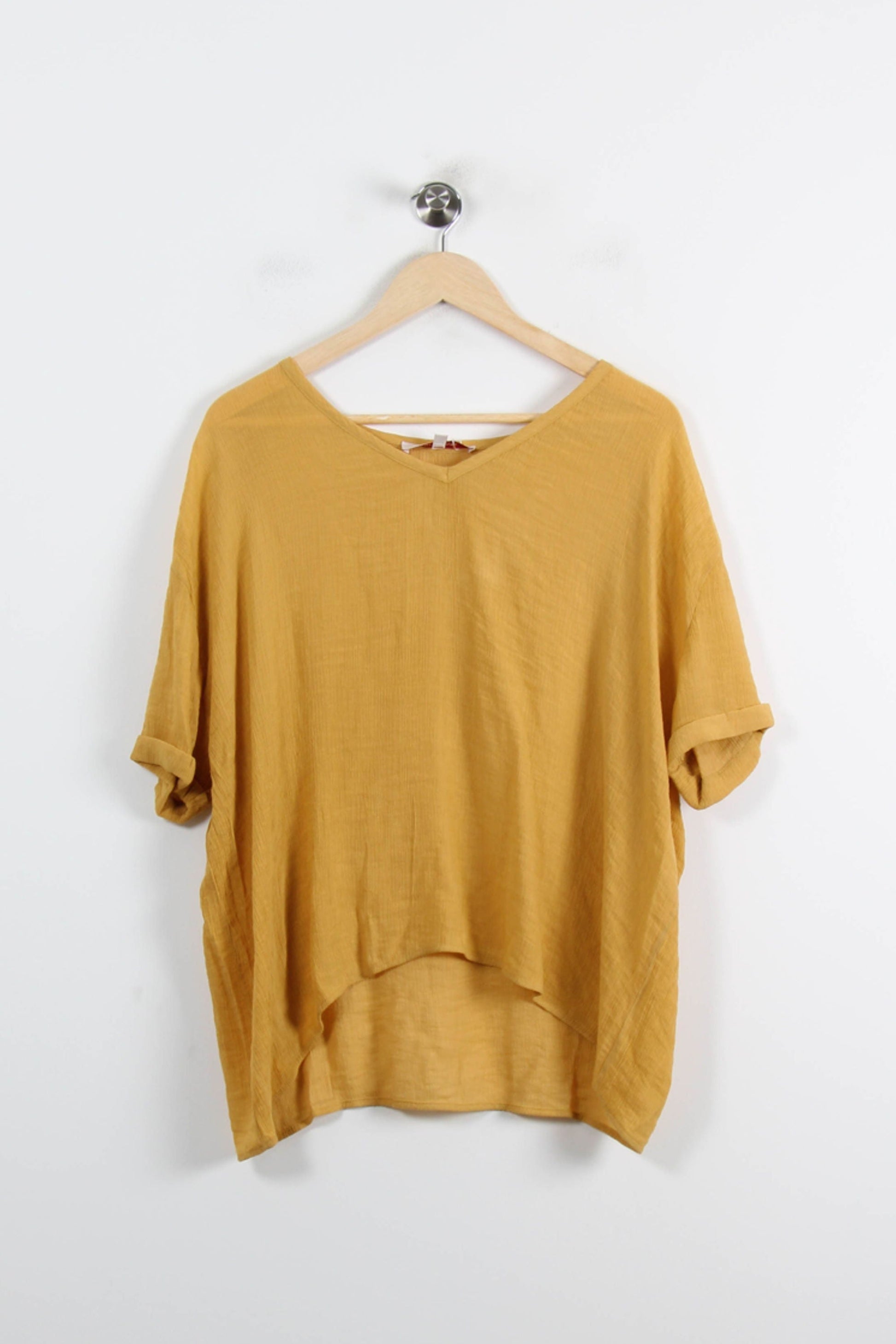Top ample jaune La Fée Maraboutée, taille XL/42, alliant confort et élégance. Confectionné dans une matière légère et fluide, il se distingue par sa coupe décontractée, ses manches courtes retroussées et son col en V, apportant une touche raffinée au modèle. Idéal pour une sortie décontractée ou une journée estivale où le confort reste élégant.