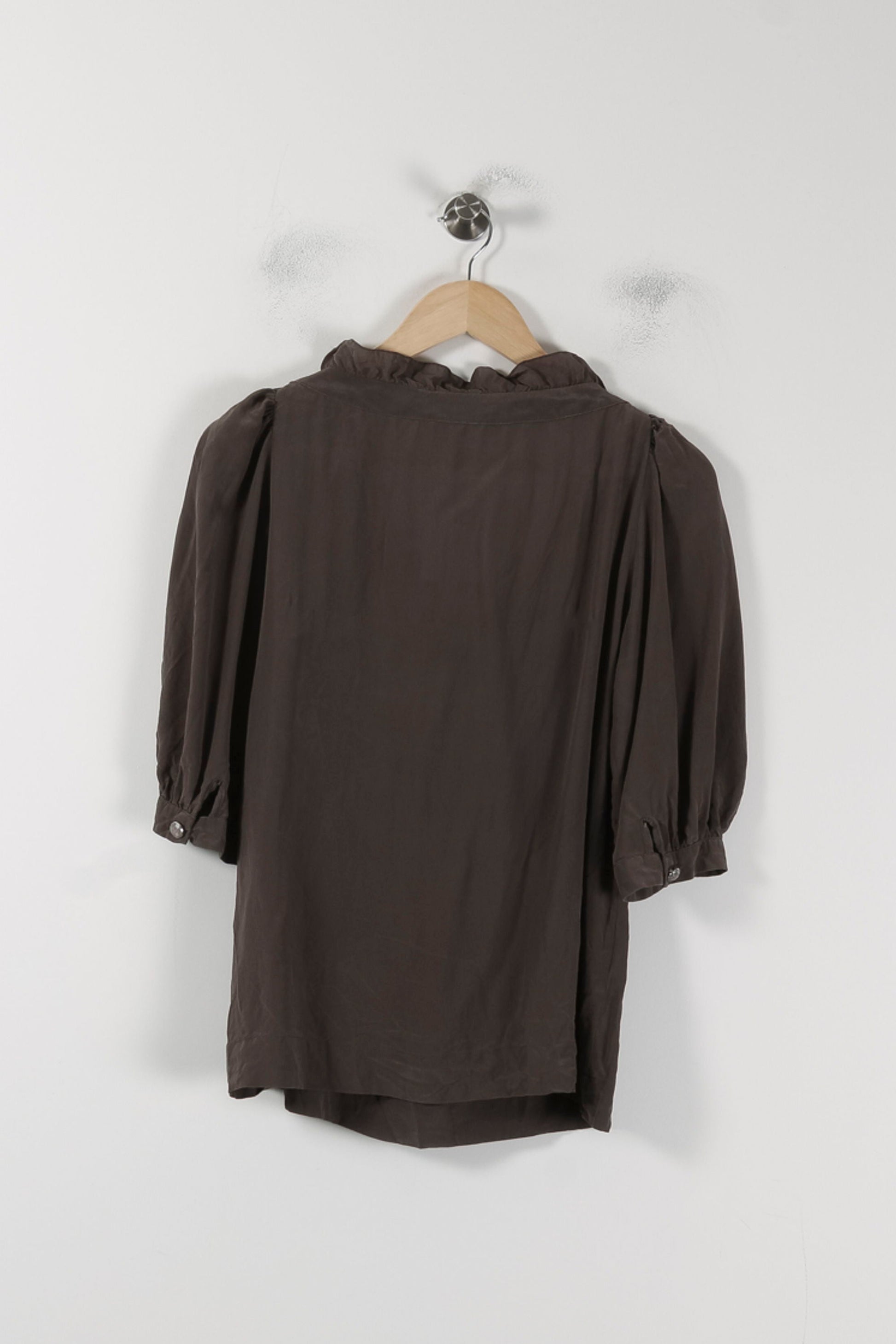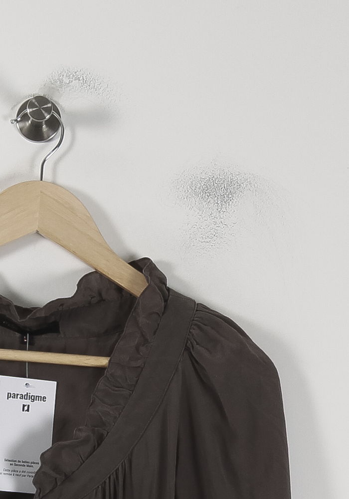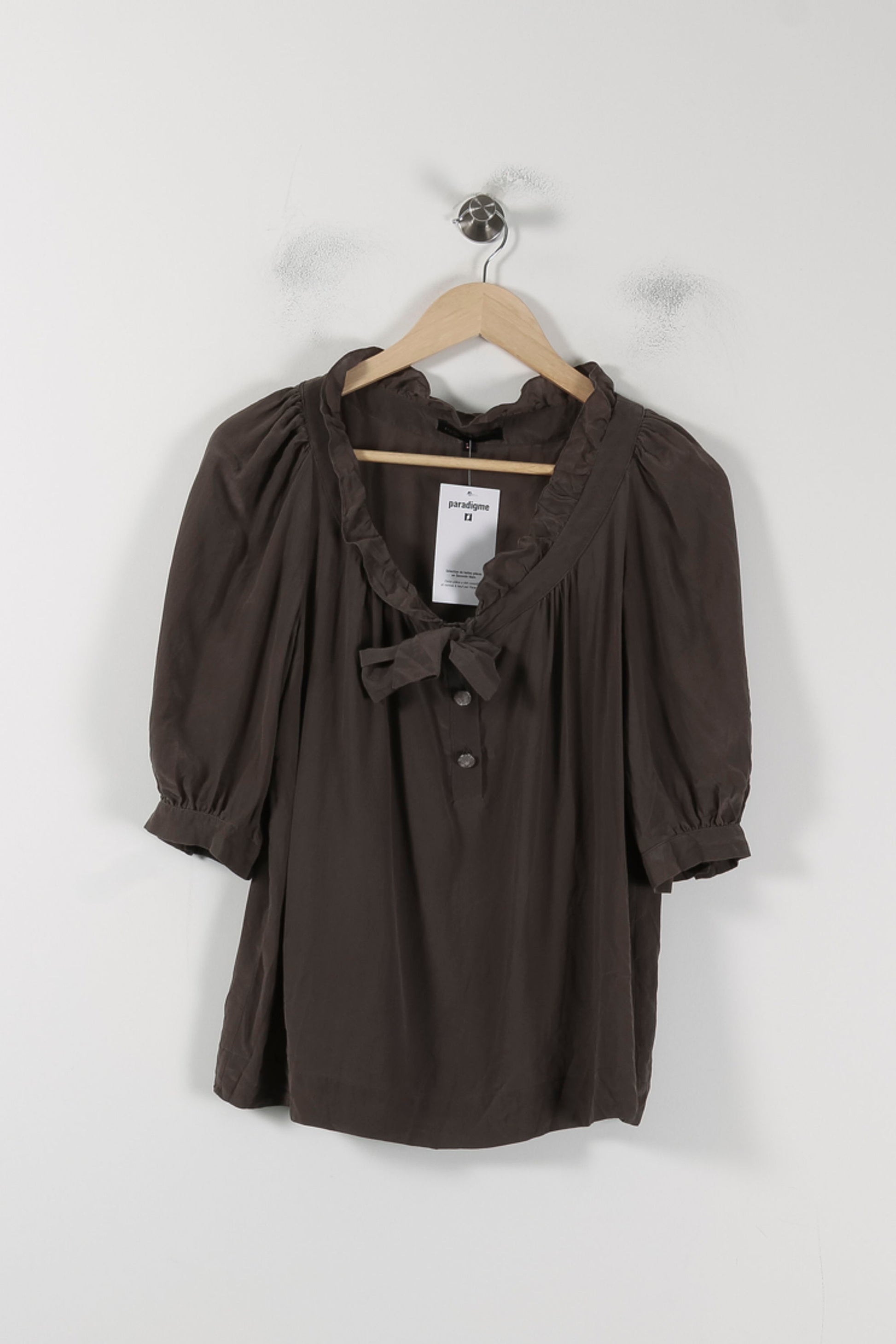 Haut et bas Maje beige taille L/40, poignets trois-quarts, encolure à volant et décoration neuve. La méthode de fabrication est parfaitement adaptée à la délicatesse du matériau, fluide et léger, associée aux détails des finitions apportées au design et à la finition finale. Idéale pour une journée au bureau ou une allure élégante en ville, elle ajoute une touche de féminité et de sophistication à votre tenue.