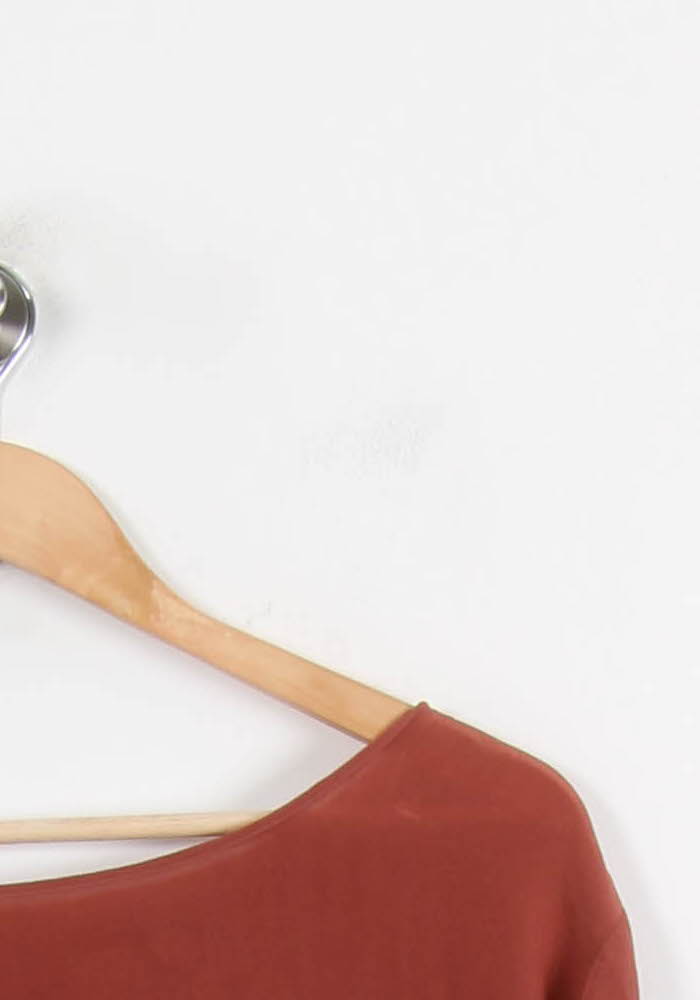 Top ample marron Diega, taille M/38 : un style basique élégant et contemporain avec une coupe fraîche. Confection réalisée dans une matière fluide à l'aspect satiné, caractérisée par des manches 3/4 et un bord bateau coloré, offrant une allure moderne et raffinée. Idéal pour une journée de travail au bureau, avec un pantalon taille haute, ou pour une tenue décontractée avec un jean.