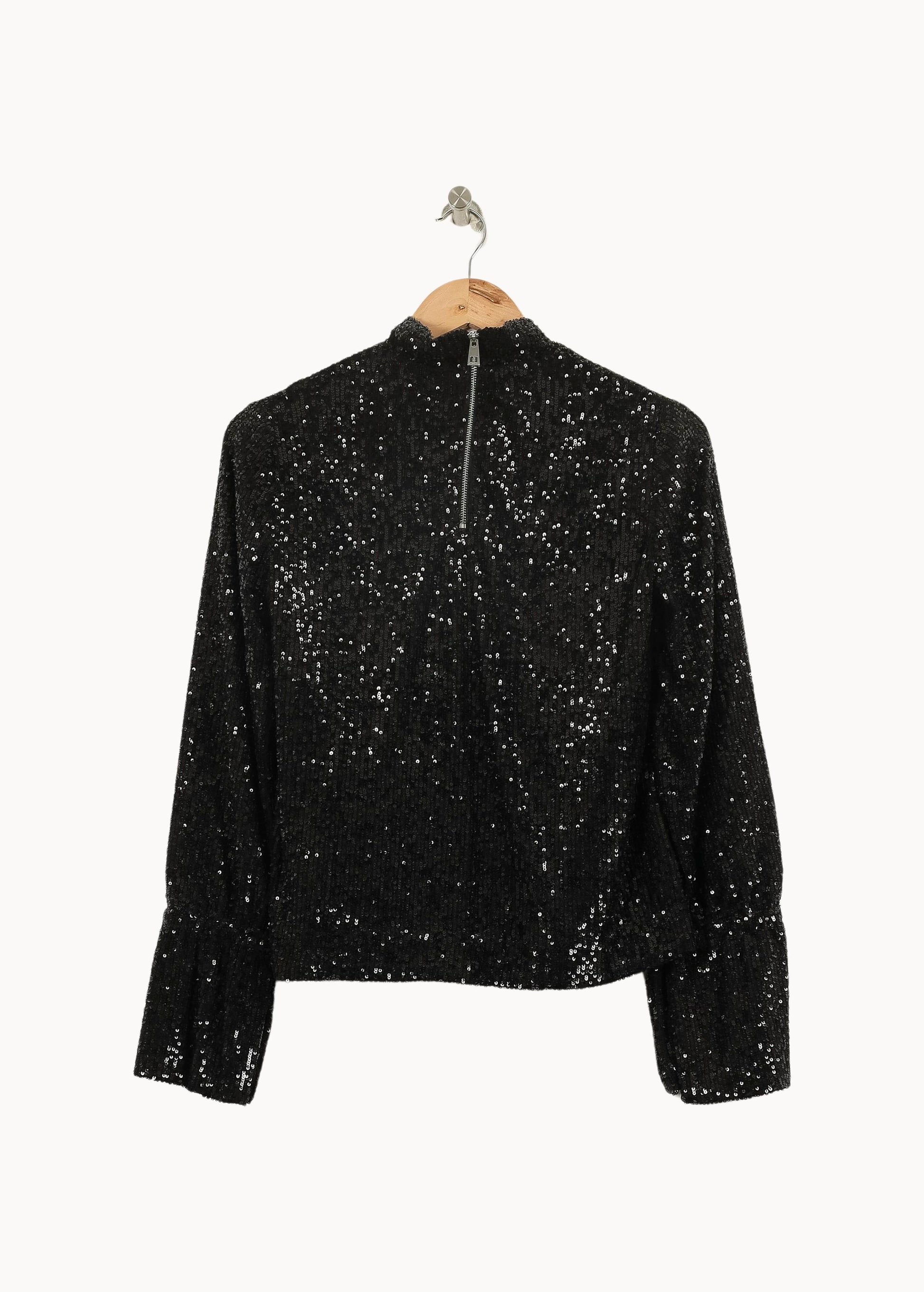 Top noir à sequins Zadig&Voltaire, taille XS/34, alliant élégance et modernité pour un look raffiné. La fabrication du matériau utilisé pour les paillettes, la distinction entre les grandes longueurs et la structure en forme de tombe, confèrent à l'ensemble son originalité. Idéal pour une soirée chic ou une occasion festive empreinte de sophistication et de style.