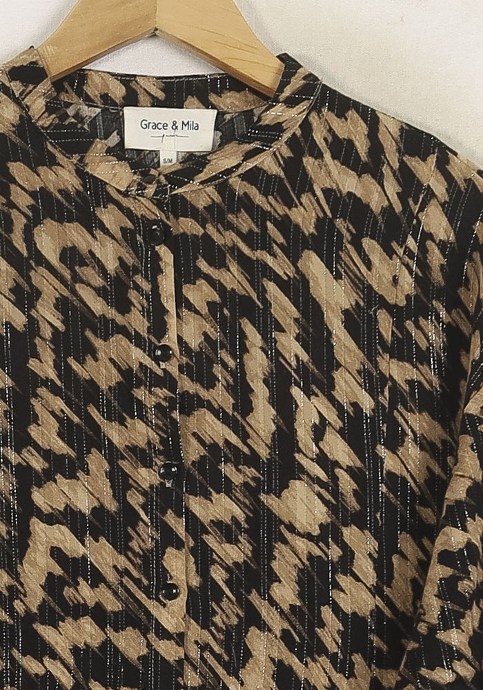 Top multicolore Grace & Mila taille M/38, à motif animalier, manches longues et col rond, parfait pour un look tendance et original. Ce haut se distingue par sa matière légère et plissée subtilement transparente, ainsi que son imprimé graphique unique qui lui confère un style audacieux et raffiné. Idéal pour une sortie entre amis ou pour apporter une touche sophistiquée à une tenue de bureau.