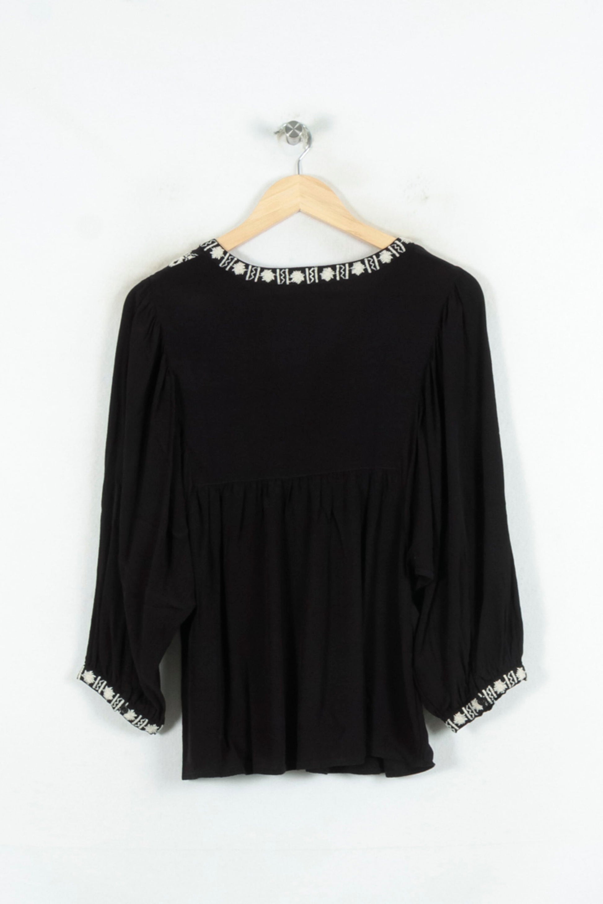 Blouse noire brodée Maison 123, taille L/40, idéale pour une touche élégante au quotidien. Confectionnée dans une matière fluide, cette pièce se distingue par ses broderies contrastantes blanches au niveau du col en V et des poignets, apportant caractère et raffinement à l’ensemble. Parfaite pour un dîner entre amis ou une journée au bureau, elle s’associe aisément à un pantalon habillé ou un jean brut.
