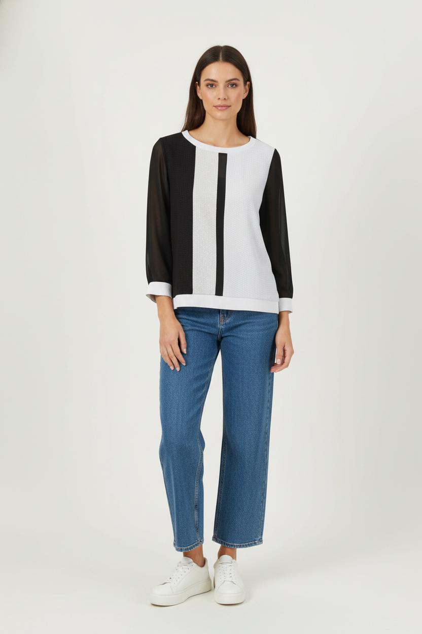 Top Sandro taille L/40, coloris noir, au design graphique avec manches longues et col rond. Confectionné dans un mélange de polyester, de coton et d'acrylique, le jeu de matières, les bandes de contrastes verticaux en noir, blanc et une touche de texture argentée, et les manches sont semi-transparentes pour une allure sophistiquée. Idéal pour une réunion professionnelle ou une soirée élégante, avec un pantalon cigarette ou une jupe.