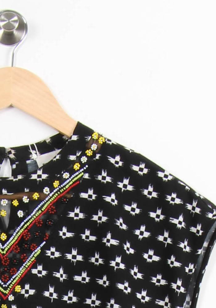 Top imprimé ethnique noir Bimba y Lola, taille S/36, coupe droite et manches courtes. La production d'une matière fluide, la distinction entre les motifs du dessin géométrique et les couleurs de la broderie au niveau de la couleur, sont appropriées pour une touche de raffinement et d'originalité. Idéal pour une sortie dans votre pays ou une soirée décontractée entre amis.