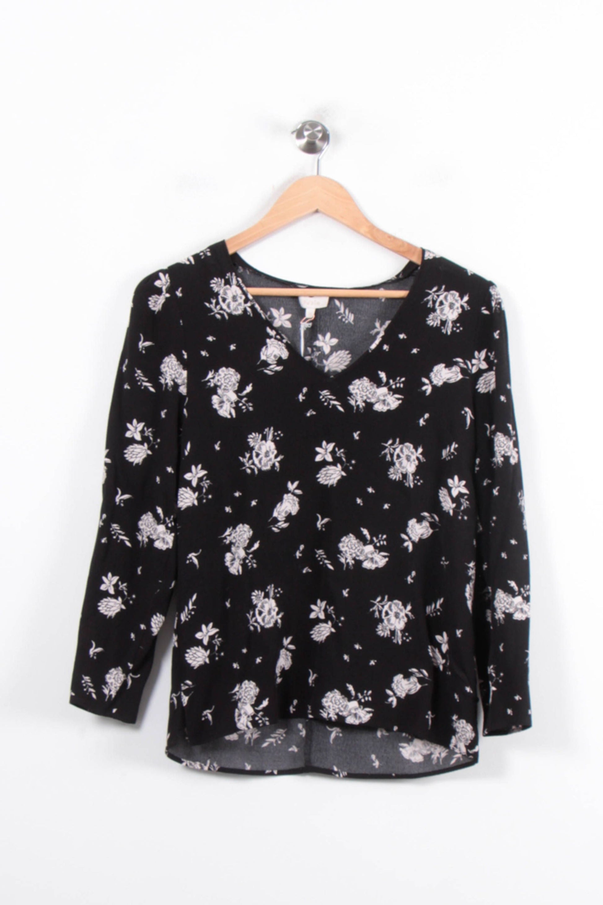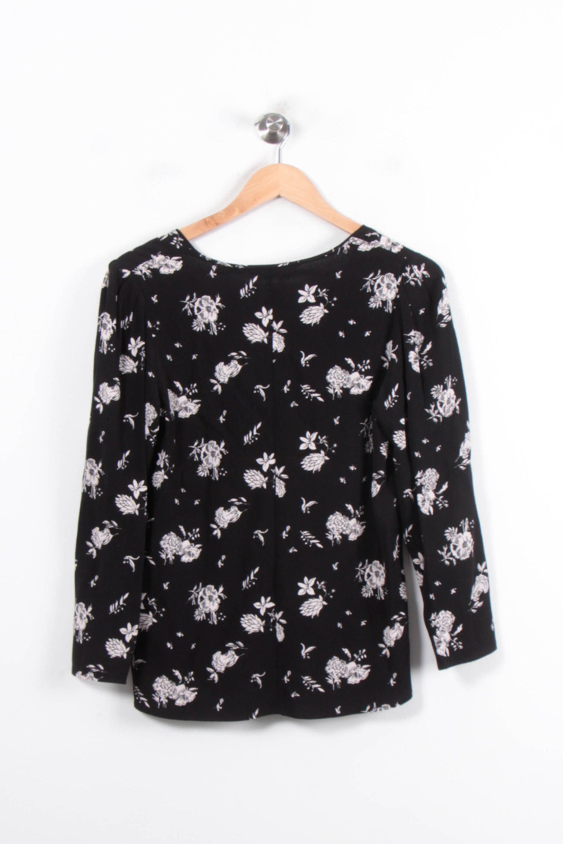 Top noir à motif floral Pablo, taille S/36, élégant et contemporain, parfait pour une garde-robe sublime. Confectionnée dans une matière fluide, elle est très résistante et présente une délicatesse florale parfaite ainsi qu'un décolleté en V, ajoutant une touche de raffinement féminin à l'ensemble. Un choix idéal pour une journée au bureau ou une sortie chic entre amies.