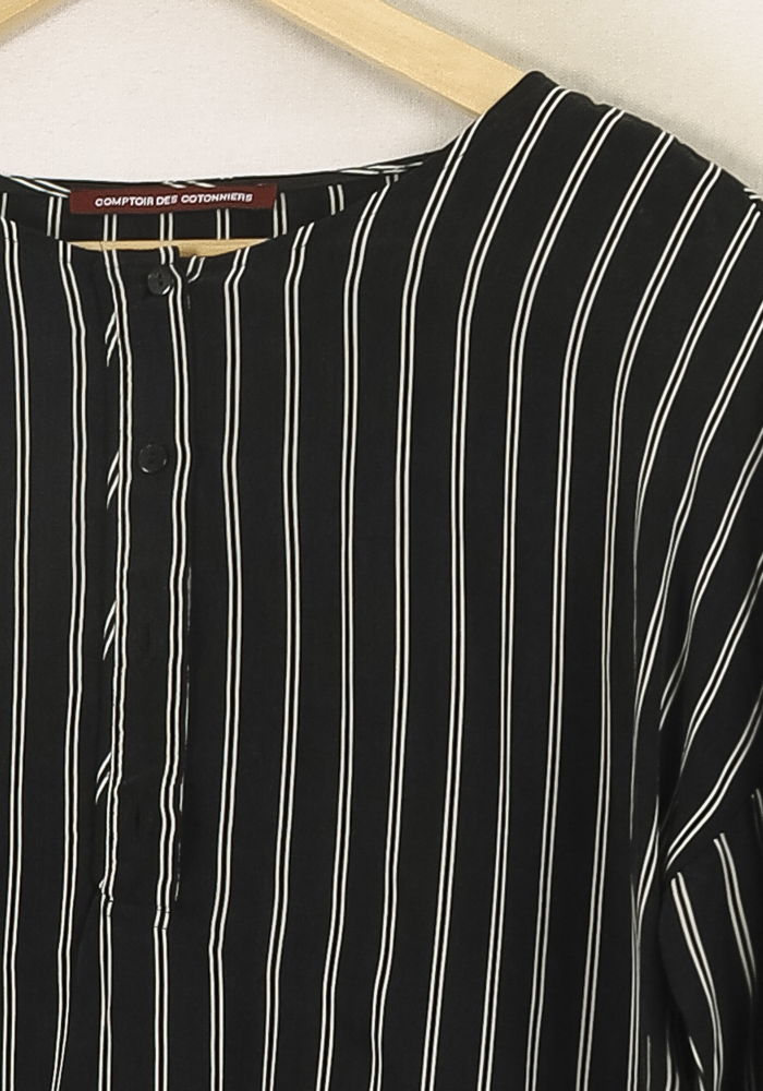 Top noir à rayures verticales Comptoir des Cotonniers, taille XL/42 – un incontournable élégant signé par la marque. Confectionné dans une matière fluide, ce haut présente des rayures fines blanches et une encolure ronde, subtilement rehaussée par une patte de boutonnage discrète, apportant modernité et raffinement. Idéal pour une journée de travail ou un dîner en ville, ce top assure confort et allure sophistiquée.