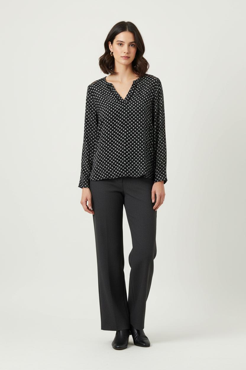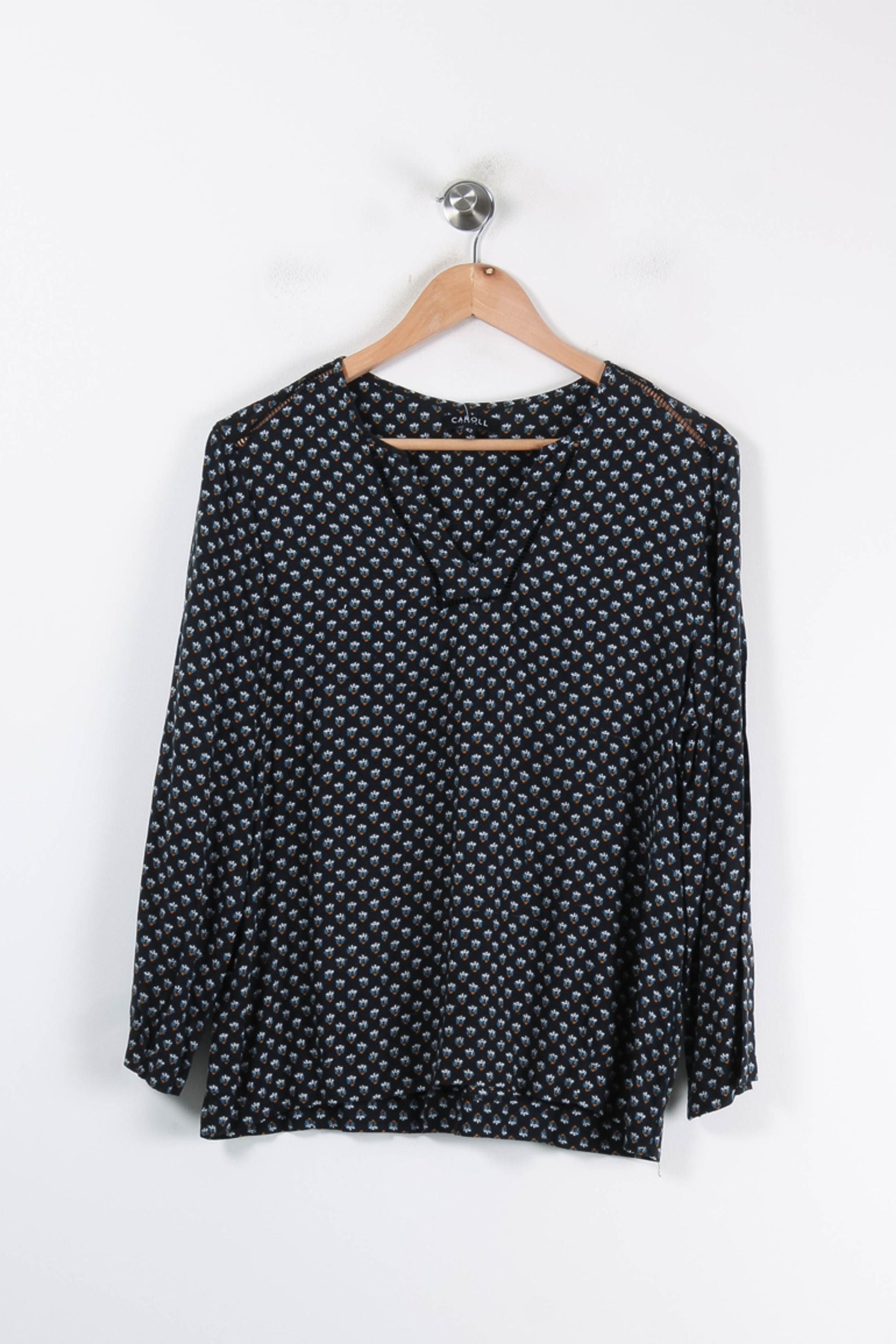 Top imprimé noir Caroll, taille XL/42, à motif floral délicat. Le modèle longue durée est réalisé dans une matière fluide et imprimée, avec une touche de raffinement féminin et une silhouette moderne. Idéal pour une journée au bureau ou une sortie pendant le contrat.