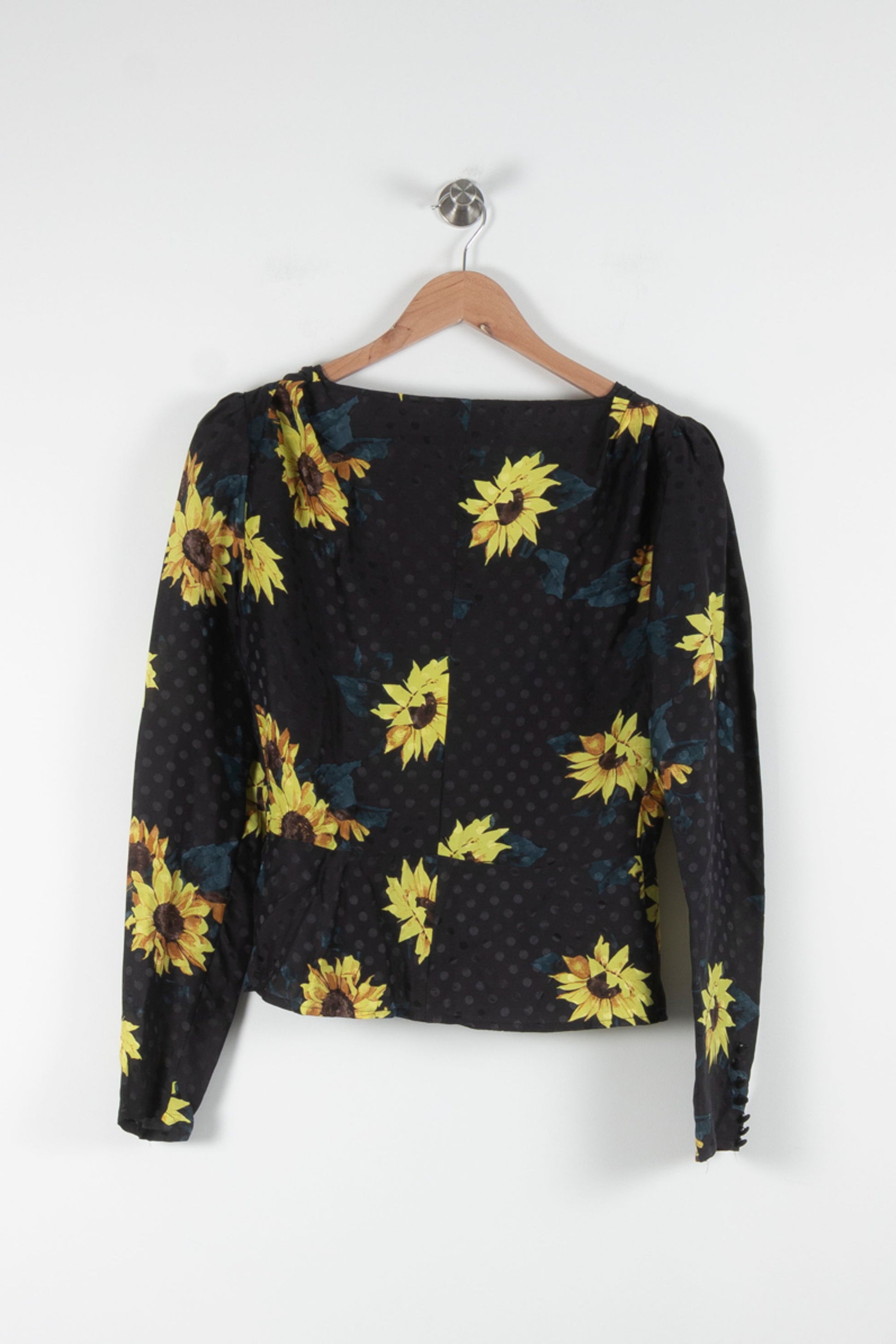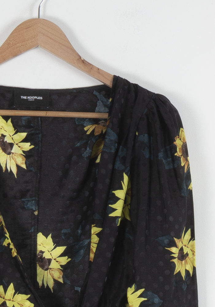 Top à manches longues The Kooples, imprimé tournesols multicolores sur fond noir, taille S/36. Le dessus se distingue par la fluidité du polissage, l'encolure des couleurs et les impressions d'avant-garde, avec une allure raffinée et une originalité affirmée. Particulièrement adapté à un dîner romantique, il s'accorde parfaitement avec une taille de jean de qualité et une tenue très élégante.