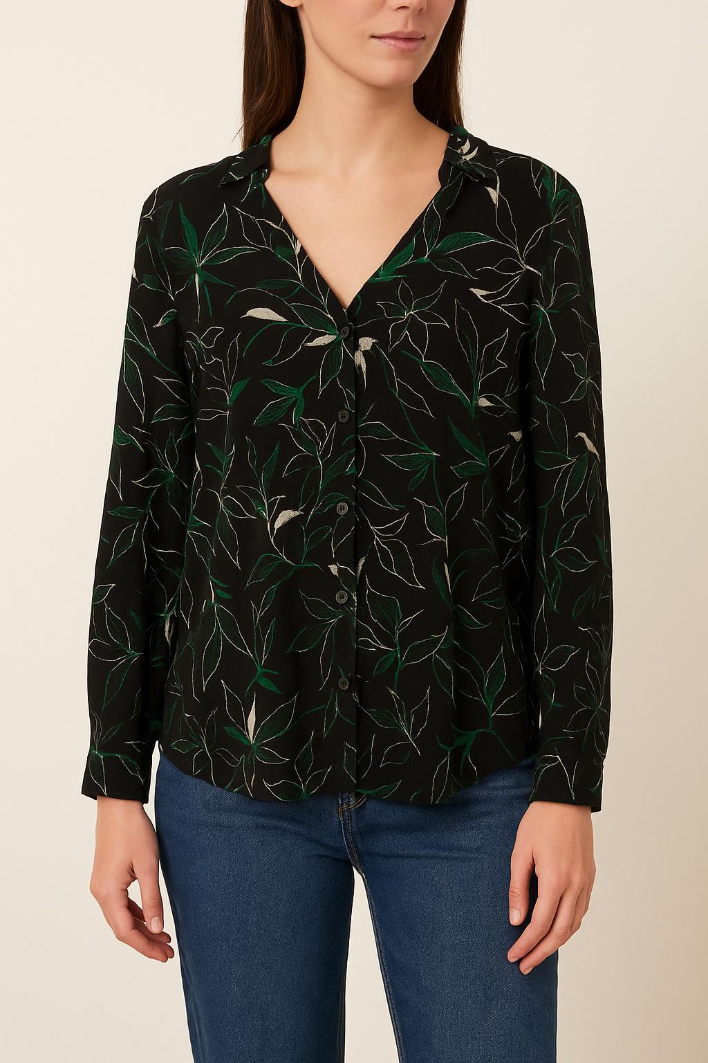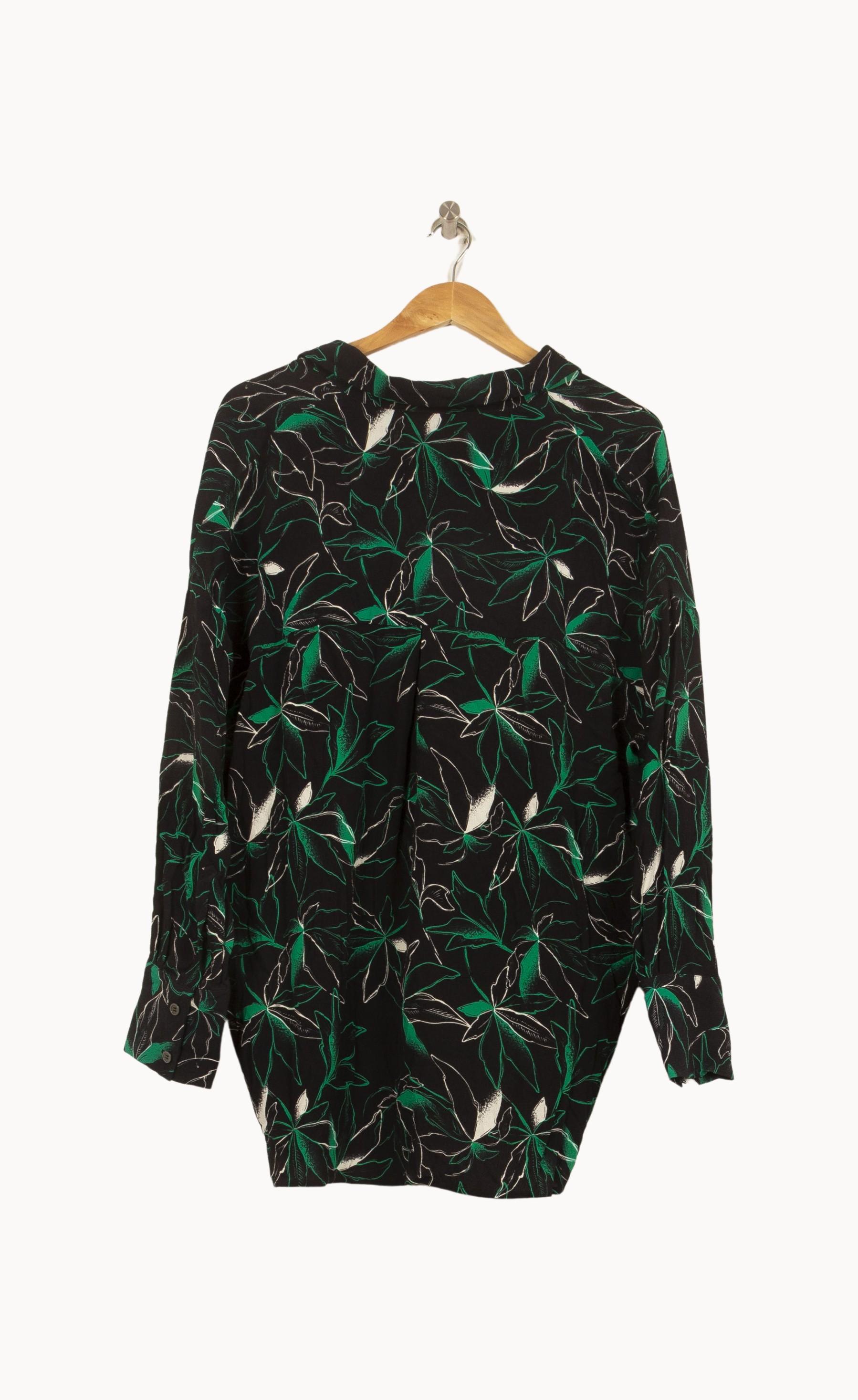 Blouse fluide Bérénice noire à imprimé feuillage vert et blanc, taille S/36, marque Bérénice. Confectionné dans une matière transparente et lustrée, le chemisier présente une finition élégante et un décolleté en V, apportant une touche d'originalité et de raffinement à la tenue. Idéal pour une journée au bureau ou une sortie en ville, il vous assure une allure chic et moderne.