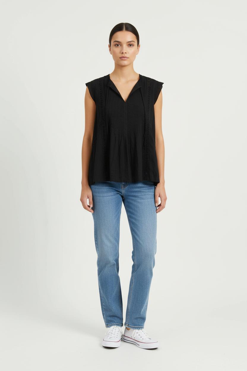 Top noir sans manches ZAPA, taille M/38, à l'encolure et V et à la coupe fluide. Confectionnées à partir d'une matière première, les broderies délicates et les ornements qui subliment l'allure raffinée et féminine sont parfaits. Idéal pour une réunion professionnelle ou une sortie élégante et une soirée.