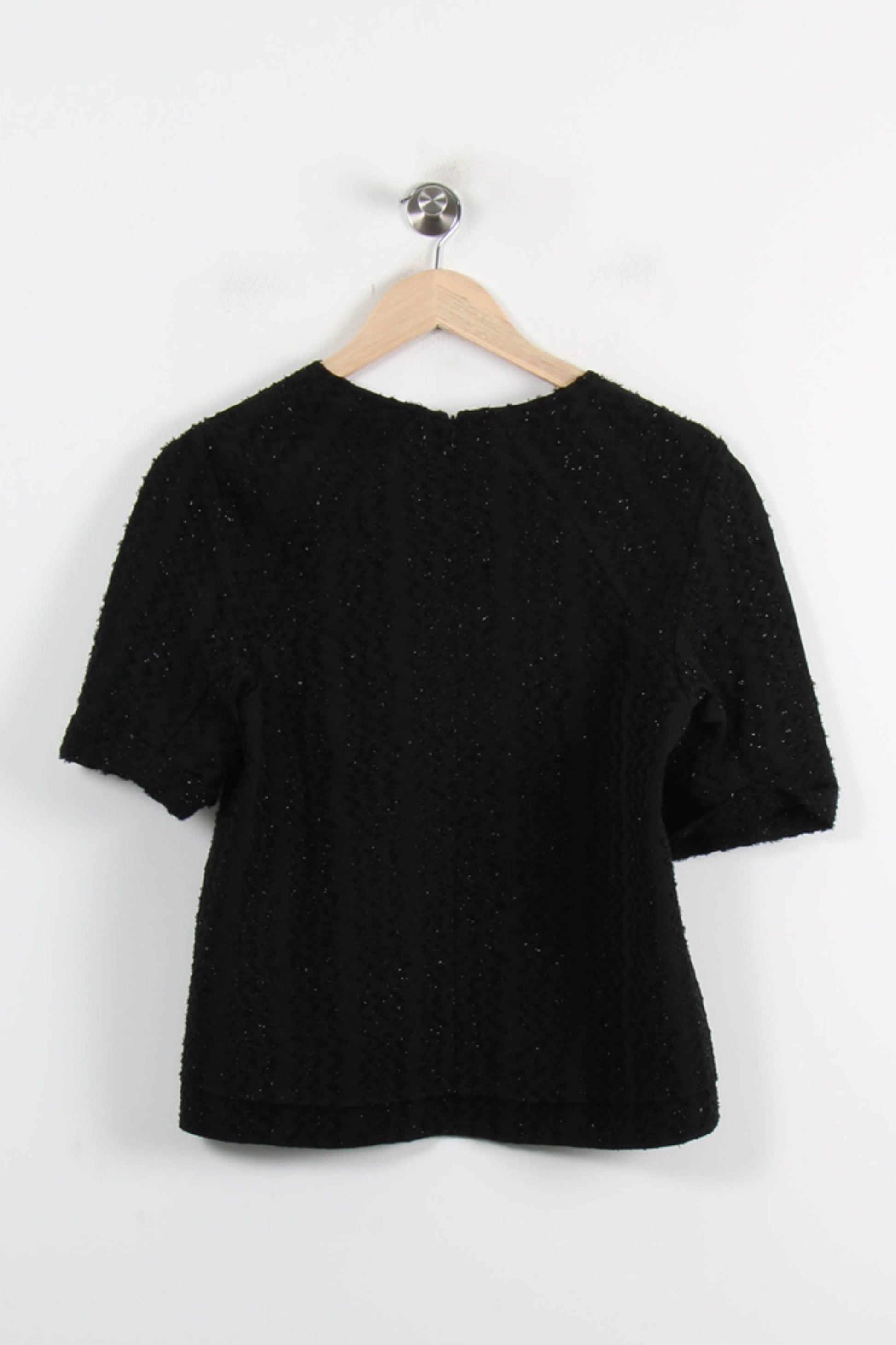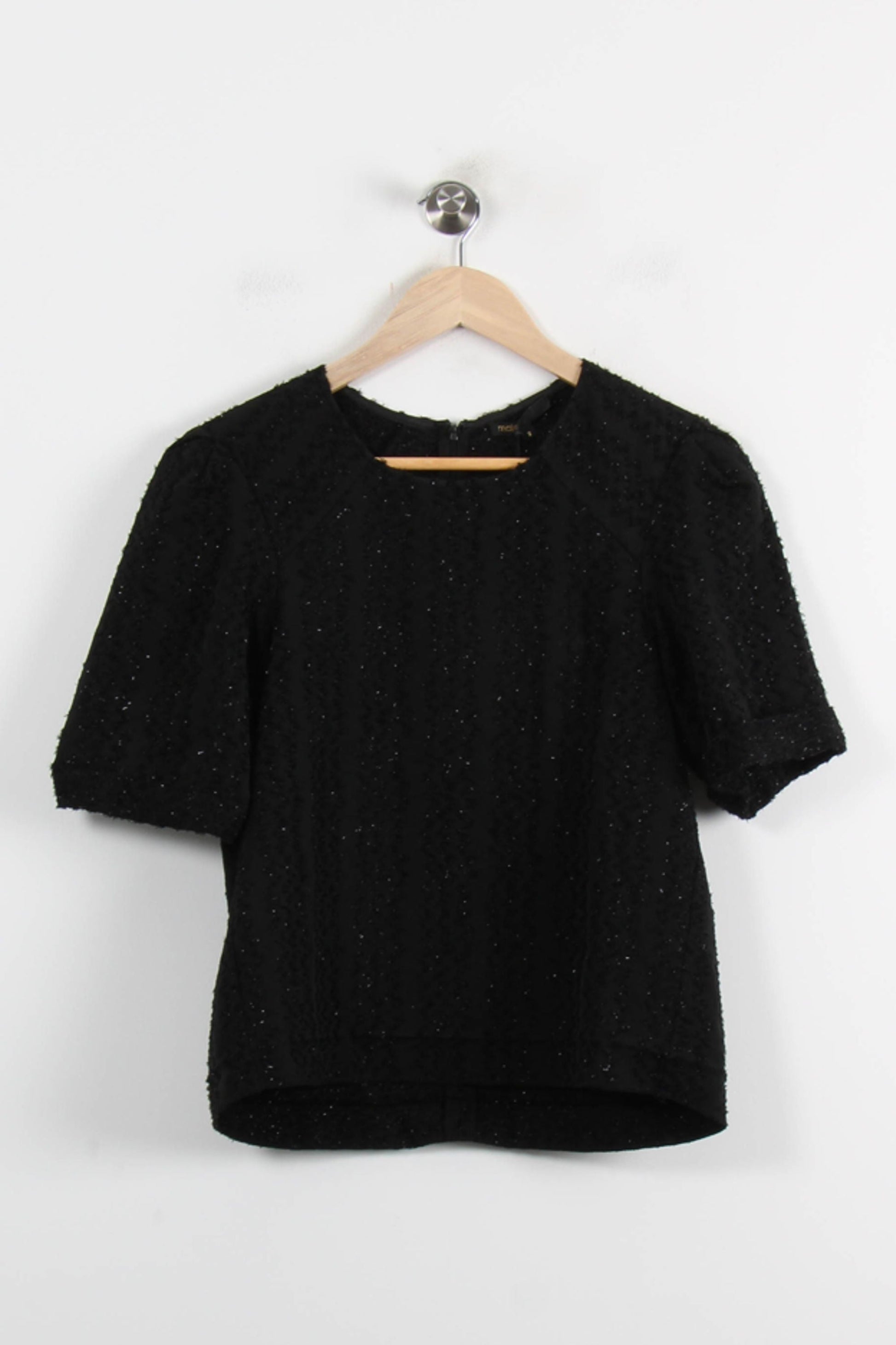Top noir à manches courtes Maje, taille M/38, raffiné et polyvalent, parfait pour sublimer une tenue élégante. Avec la matière de texture, en réévaluant les détails subtils et le relief, en considérant le raffinement et le raffinement de l'aspect, la connaissance emblématique de Maje. C'est l'idée parfaite pour un dîner chic ou une soirée élégante.