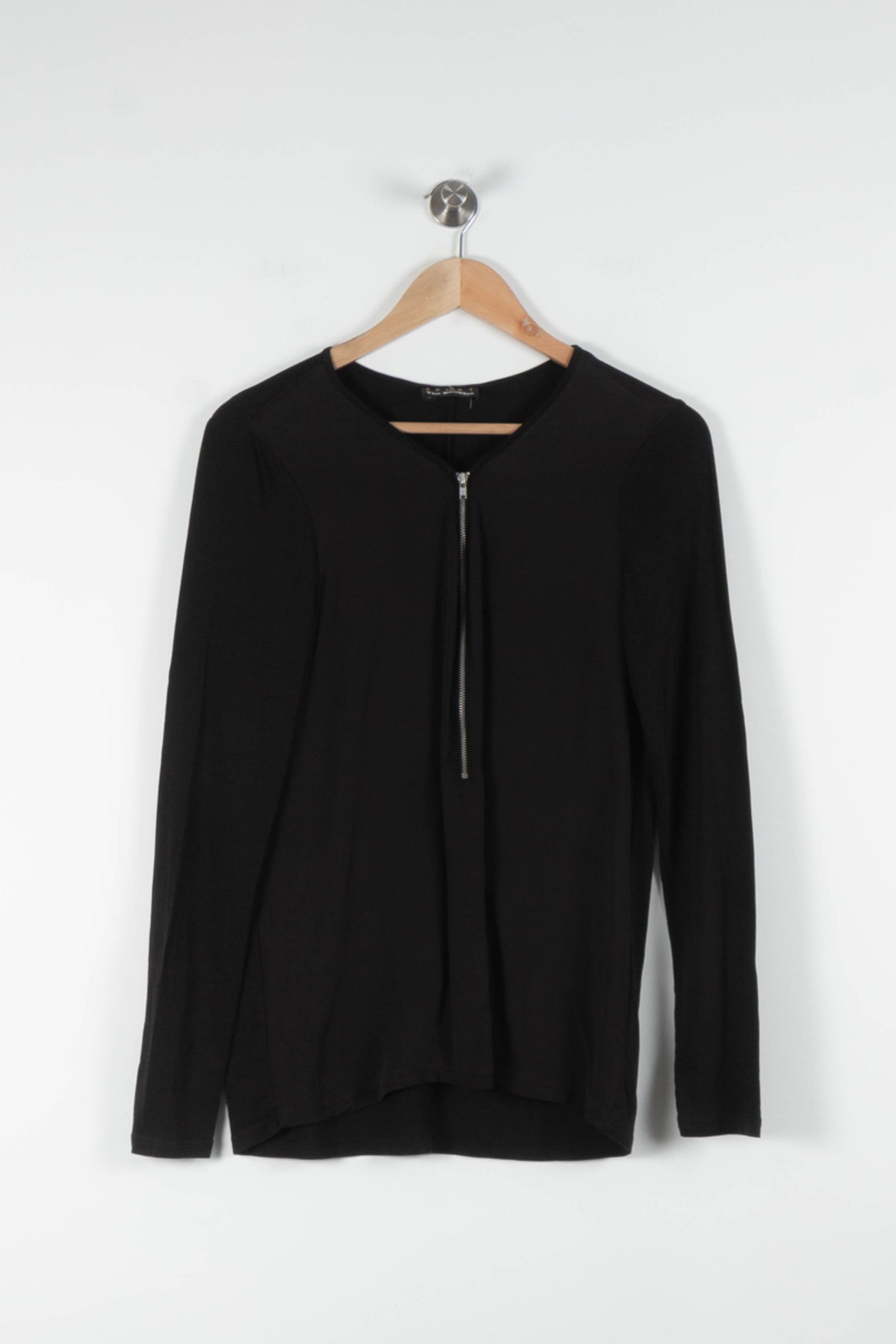 Top noir The Kooples à manches longues, taille M/38, présenté dans une élégante ferme avec une touche frontale pour une touche contemporaine. Cette confiserie, à la matière fluide et onctueuse, se distingue par sa coupe simple et son flacon en métal frais, alliant modernité et raffinement. Parfaite pour une réunion professionnelle ou un dîner en ville, une allure sublime pour une silhouette sobre et élégante.