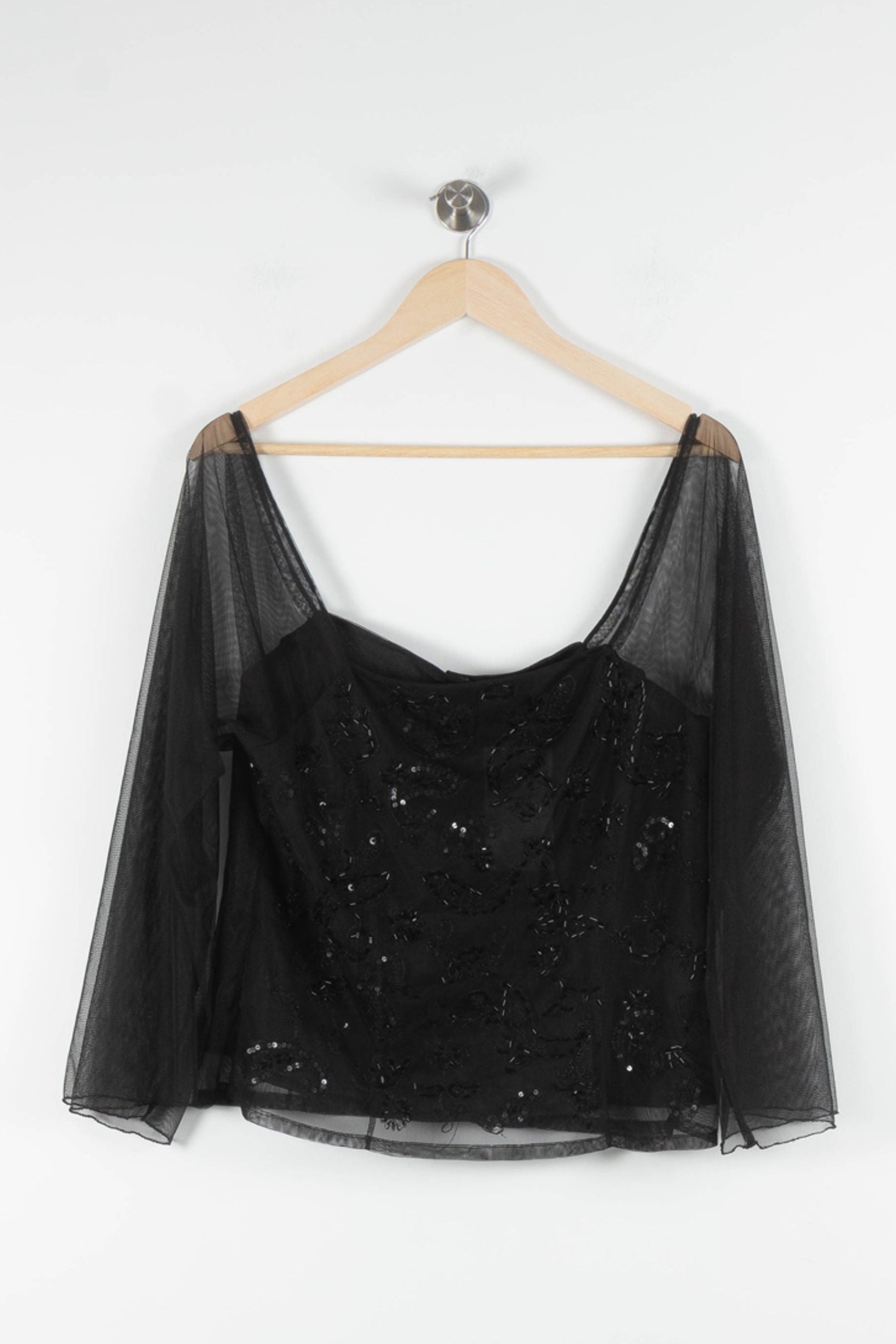 Top noir à manches longues transparentes Derhy taille M/38, une pièce élégante et sophistiquée de la marque. Le tissu principal est composé à 100% de polyester avec une double couche de polyamide à 100%. Le haut se distingue par la transparence du vêtement et les motifs sont raffinés et affinés par les sequins sur la poitrine, ce qui est très subtil et raffiné. Idéale pour une soirée chic, cette robe offre une allure confortable, une silhouette sublime empreinte d'originalité et de finesse.