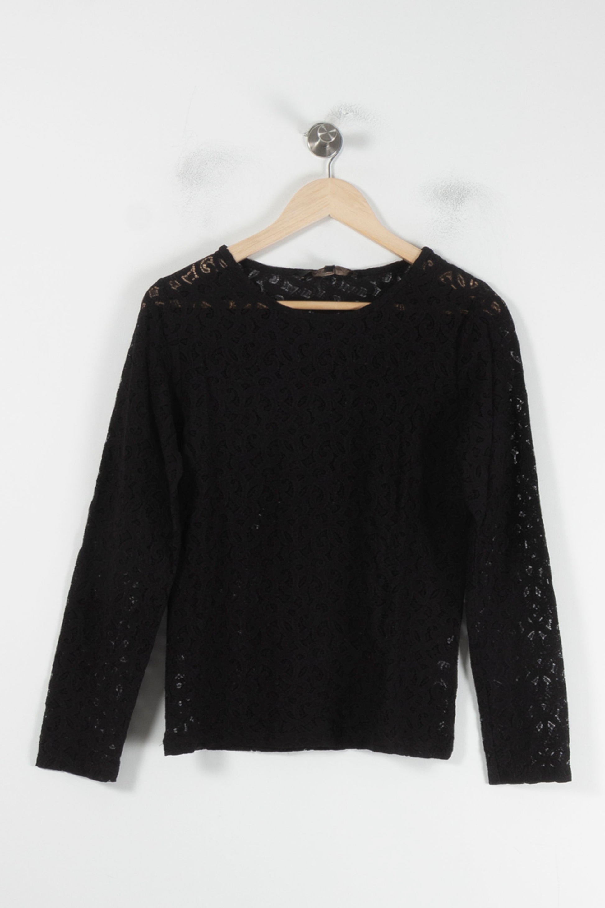 Top noir à manches longues La Fée Maraboutée, taille M/38, alliant élégance, raffinement et modernité. Confectionné en polyamide 100%, ce haut est réalisé avec le plus grand soin et un raffinement extrême, lui conférant une touche unique de sophistication. Idéale pour une soirée chic ou un dîner raffiné, pour une allure sublime et subtile.