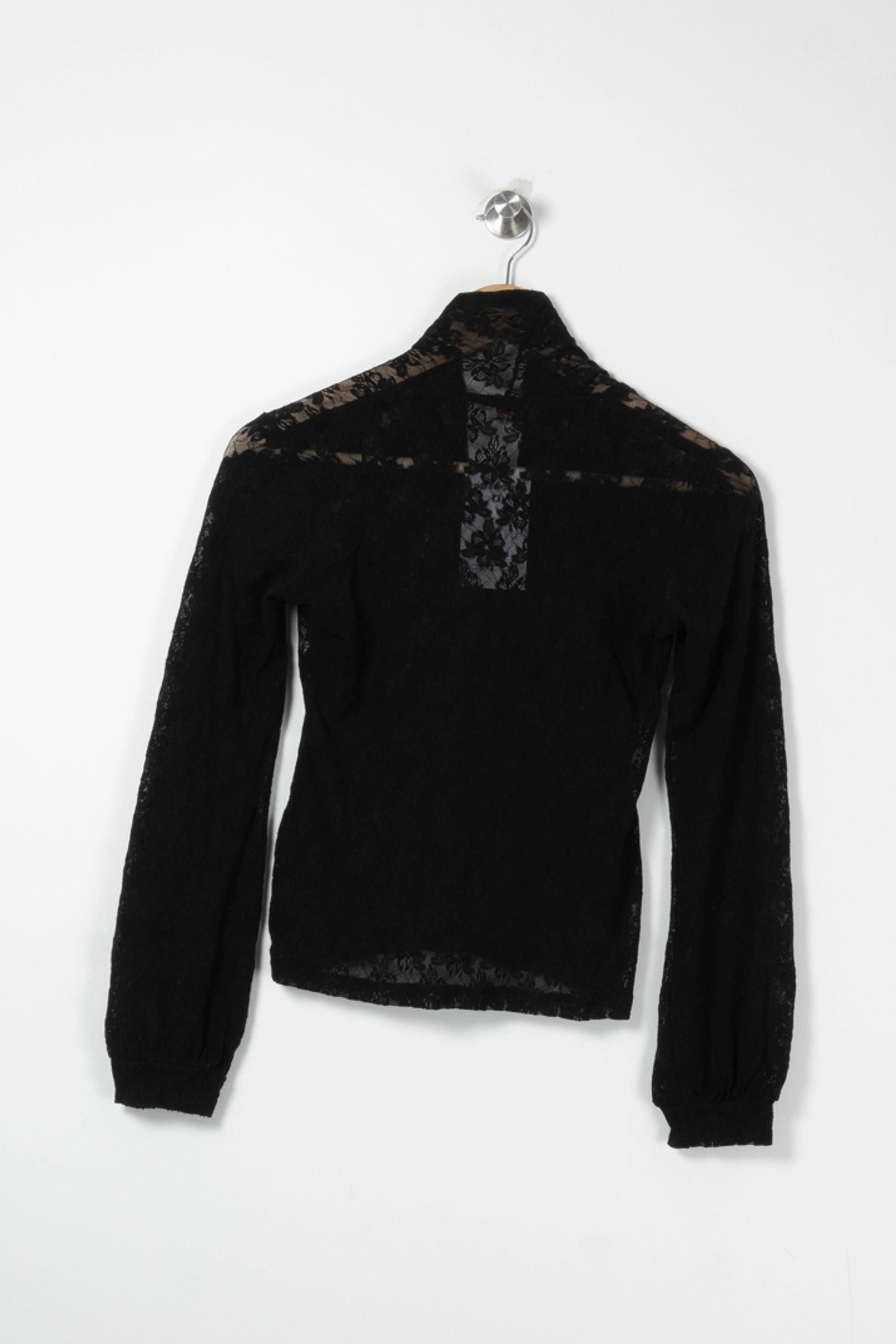 Top noir Stella Forest, taille M/38, avec manches longues transparentes et dentelle, avec élégante lavallière. Les manches et la partie supérieure du buste sont soigneusement conçues et délicates, permettant une transparence raffinée et ajoutant une touche de sophistication à l'ensemble. Parfait pour une réunion professionnelle ou une soirée élégante, pour un look sublime alliant chic et féminité.
