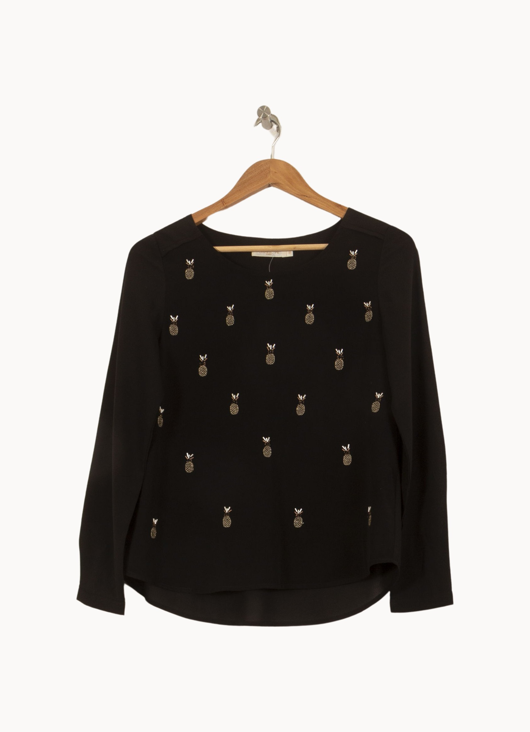 Top noir à manches longues orné de broderies ananas, Grace & Mila, taille S/36. Ce haut se distingue par sa matière fluide et confortable, sublimée de broderies dorées en forme d’ananas qui lui apportent une touche d’originalité raffinée. Idéal pour un déjeuner entre amis ou pour apporter une note élégante à une tenue de bureau.